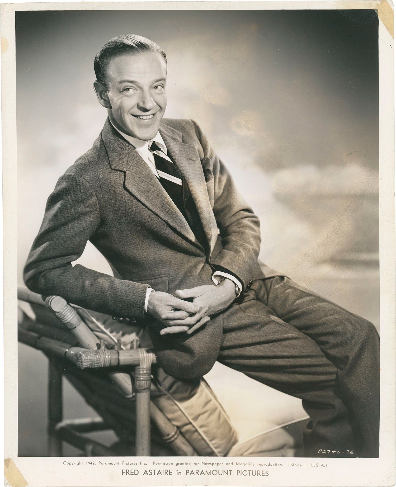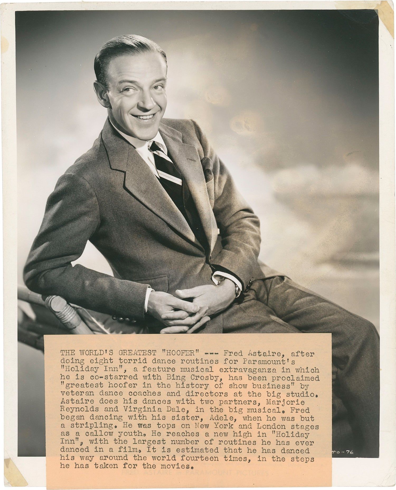 Los Angeles: Paramount Pictures, 1942. Vintage publicity photograph of actor Fred Astaire in 1942. Printed mimeo snipe affixed to the verso, promoting Astaire's appearance alongside Bing Crosby in the 1942 film "Holiday Inn."