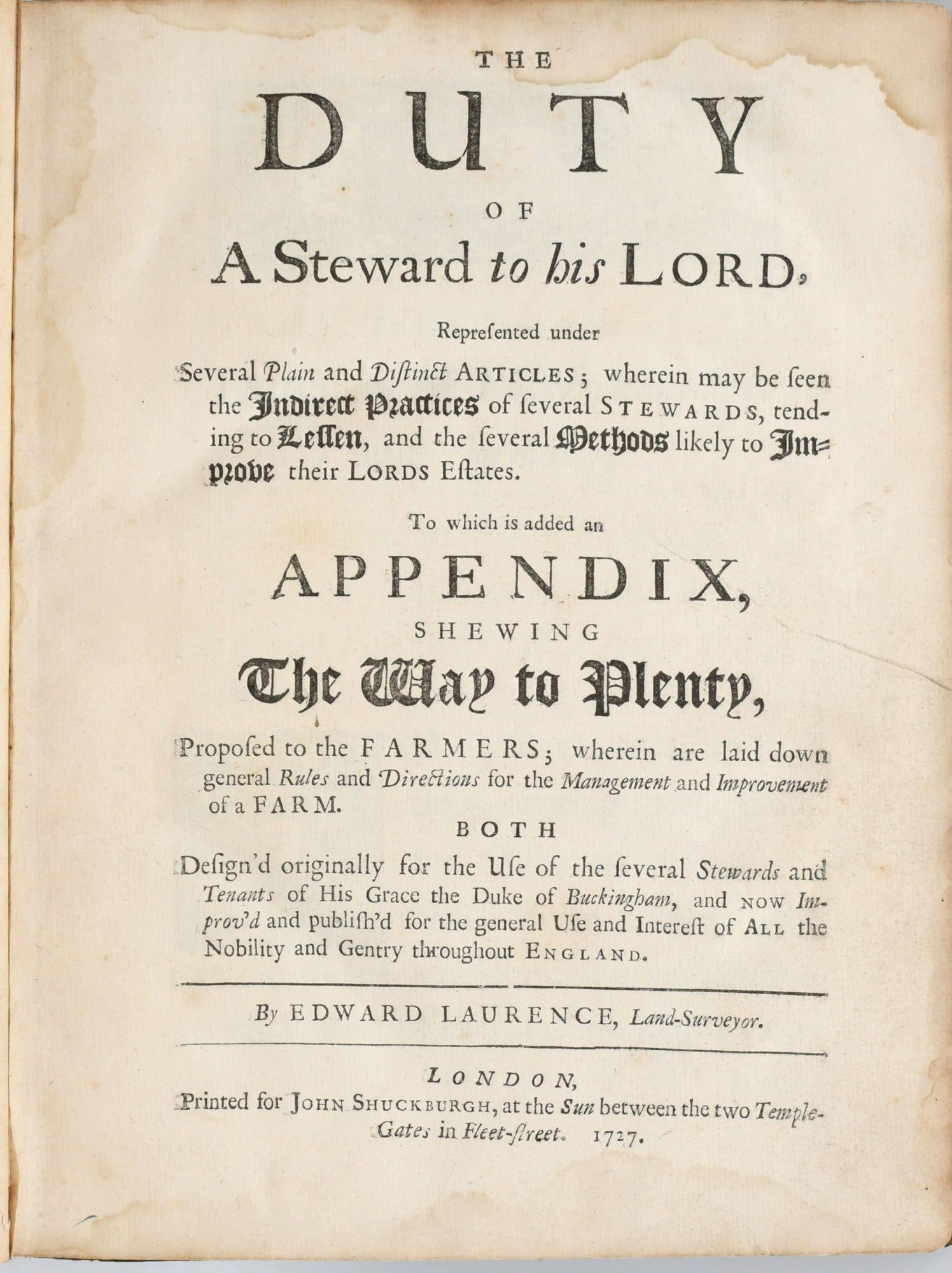 [ESTATE MANAGEMENT] THE DUTY OF A STEWARD TO HIS LORD REPRESENTED UNDER SEVERAL PLAIN AND DISTINCT ARTICLES ... TO WHICH IS ADDED AN APPENDIX SHEWING THE WAY TO PLENTY PROPOSED TO THE FARMERS ..