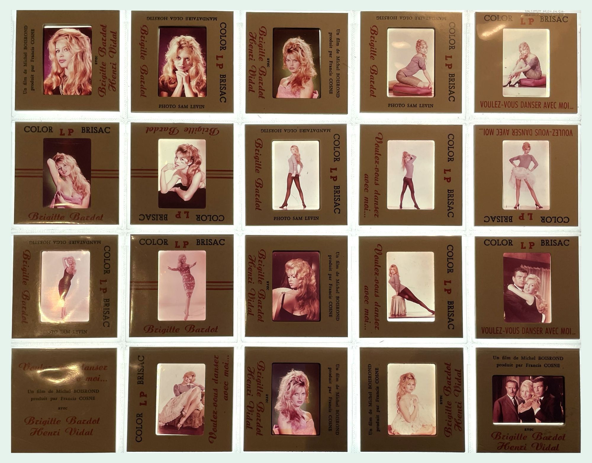 Paris: Cinédis, 1957. Collection of 19 vintage color slides taken by photographer Sam Levin, most with Brigitte Bardot as the subject, for the 1957 French film. Occasional annotations in manuscript ink on the cardboard sleeves.