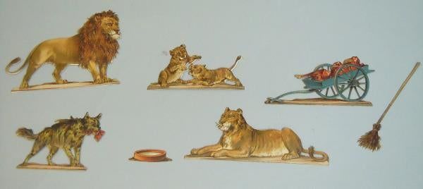An intricately detailed little group of embossed die-cut card stock toys. Includes a lion, lioness and two cuts, who appear somewhat docile with a nearby dish of milk. It also includes a less then docile hyeana who has presumably grabbed meat from the wagon. c1900. Light wear. The lion measures 4 1/2” x 3”.