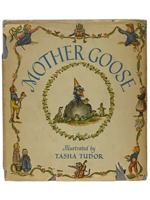 New York: Oxford University Press, 1953. 7th Printing. Hard Cover. Good/Fair. 0x0x0. Tudor, Tasha. 1953 7th printing. Very good in fair jacket. Board edges faded, several 1/2 - 1 chips from jacket corners, 2 inch chip from jacket spine head, jacket toned. 87 pp. Tasha Tudor's charming color illustrations accompany dozens of classic Mother Goose nursery rhymes.