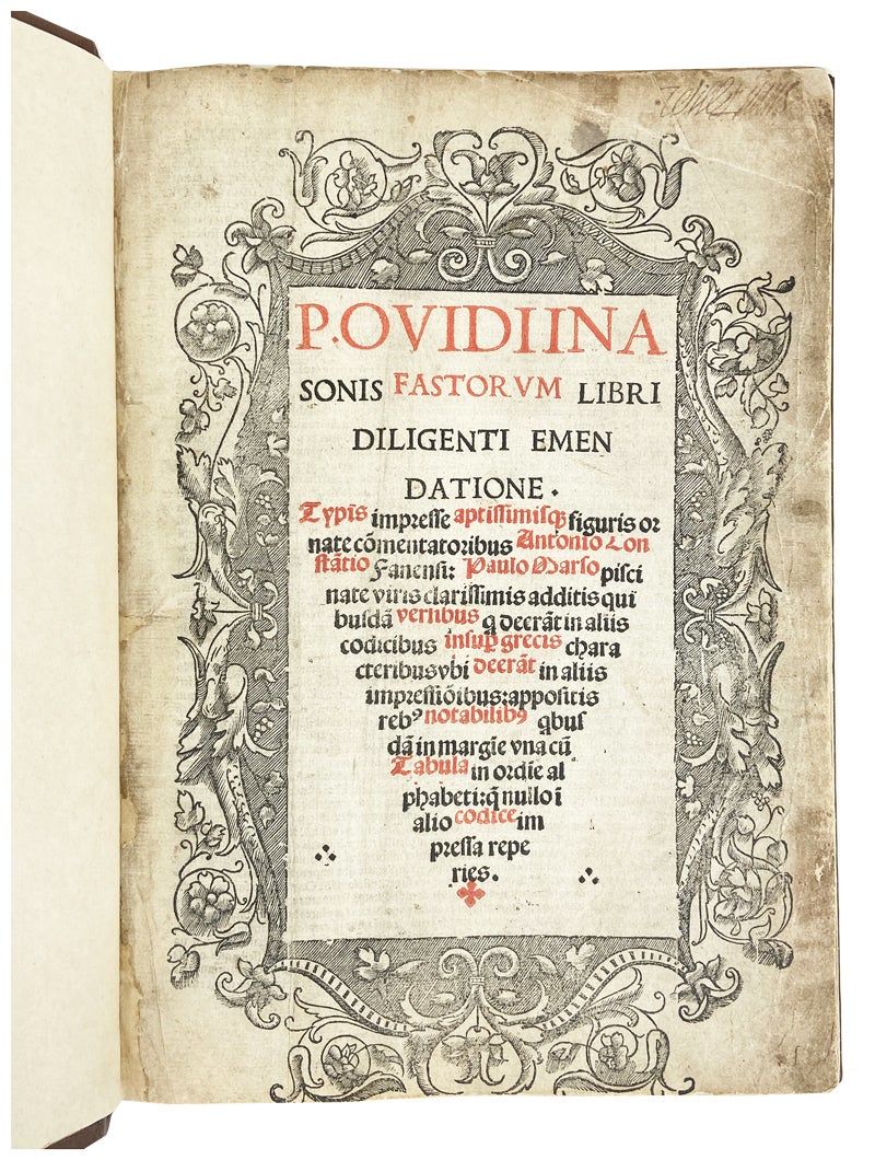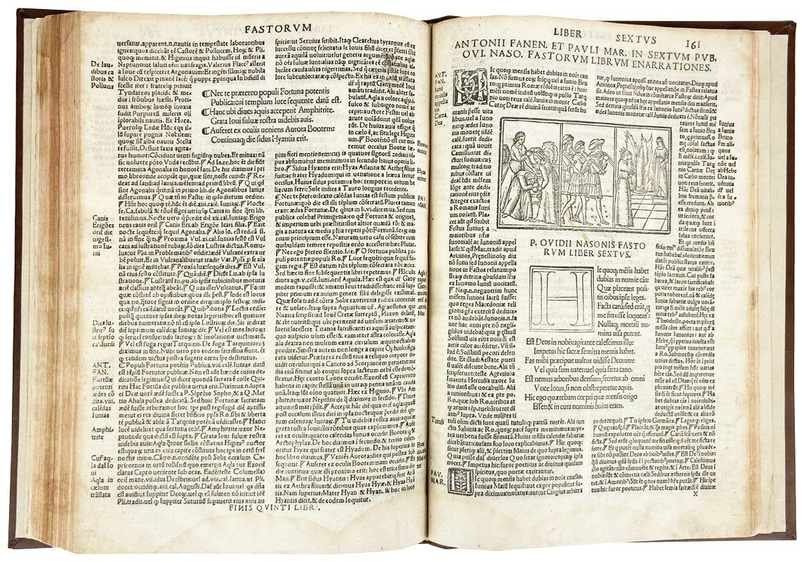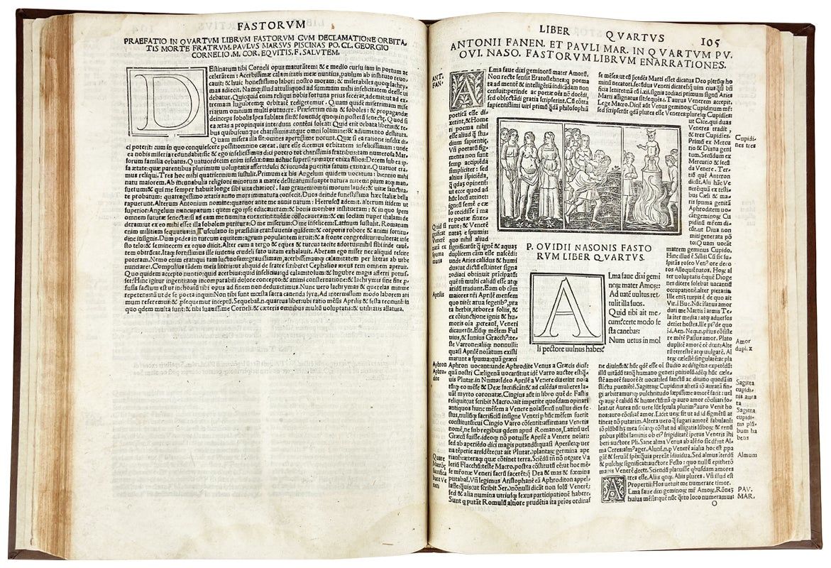 Uncommon edition of Ovid's lengthy poem in six books the Fasti, also known as the Book of Days or the Roman Calendar. This work applies the standard format of an annotated edition by placing the text of the poem at the center of the page with commentary in double columns surrounding it. Only the six books devoted to the first six months of the year survive, each book in this edition opening with a two- or three-paneled woodcut vignette.