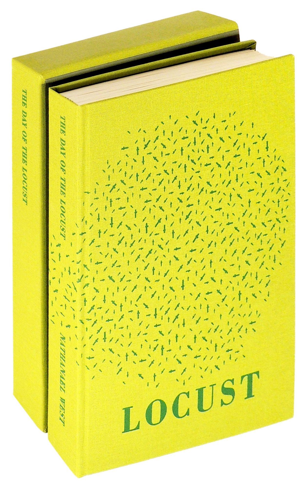 The book was designed and produced by the Press under the direction of Andrew Hoyem. It is bound in a chartreuse cloth with green titling to the spine, and the word "Locust" on the cover with what appear to be a swarm of locusts. It is letterpress printed in Monotype Bodoni Book type on Italian Mouldmade Magnani Velata paper, lighter for the text and heavier for the photographs that are tipped into die-stamped recesses. The photographs are done in the manner of stills as if taken at night. They were printed in duotone over a metallic silver ground, overlaid with varnish. Housed in a green paper covered slipcase, edged in the chartreuse cloth. Accompanied by two copies of the prospectus, one of which has a slip stating that it is a revised prospectus. The first prospectus has a sample photograph from the book. In fine condition. Measures 7 x 9.75 inches. 180 numbered pages plus twenty unnumbered pages for the photographs.
