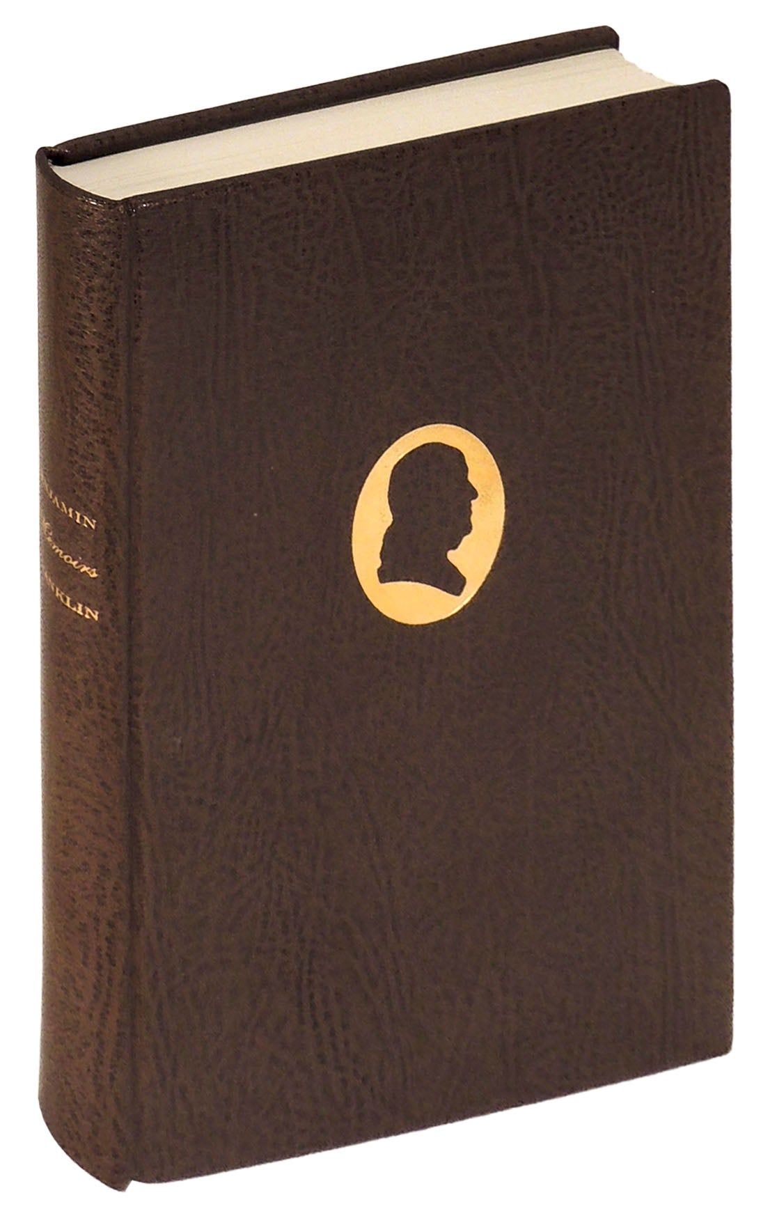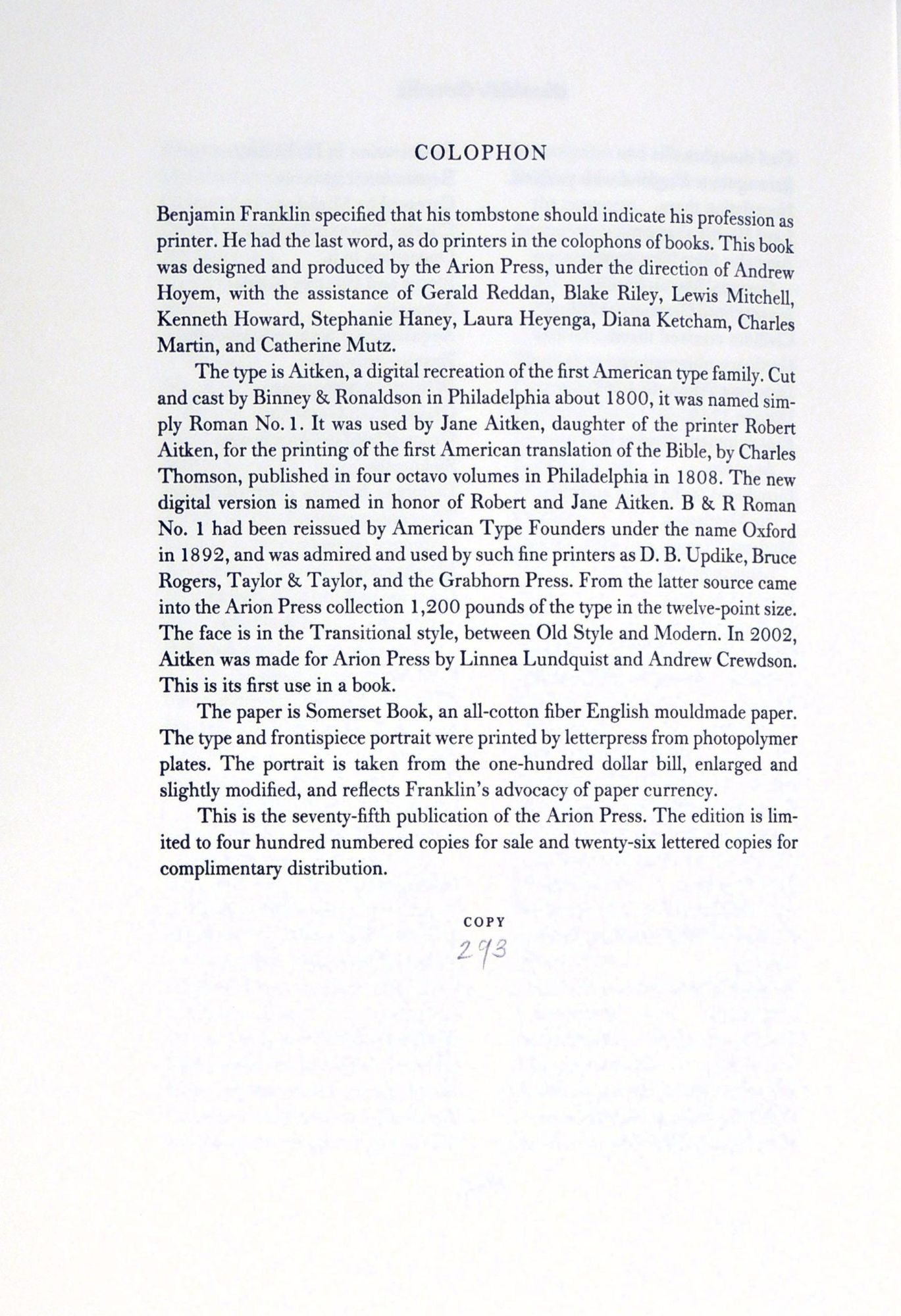 The Arion Press opted for a straightforward typographic presentation of Franklin's text without introduction, illustrations, or notes. However, the Press made its own distinctive contribution to the history of printing in the United States. Hoyem took advantage of 21st century technologies to revive what is believed the first type family cut and cast in America in 1800. The type was used by Jane Aitken, daughter of Robert Aitken, the famous printer of the American revolution, for the first printing of the first American translation of the Bible in 1808. Bound in full brown goatskin, with titling on the spine and an oval silhouette of Franklin in profile stamped in gold, adapted from a postage stamp. Printed on Somerset Book, an English mouldmade paper. There is a frontispiece portrait of Franklin, taken from the one-hundred dollar bill. Accompanied by the prospectus, but does not include the Press keepsake "Franklin's Memoirs Lost and Found. In fine condition. Measures 6.5 x 9 inches. 188 pages. PRI/110424.
