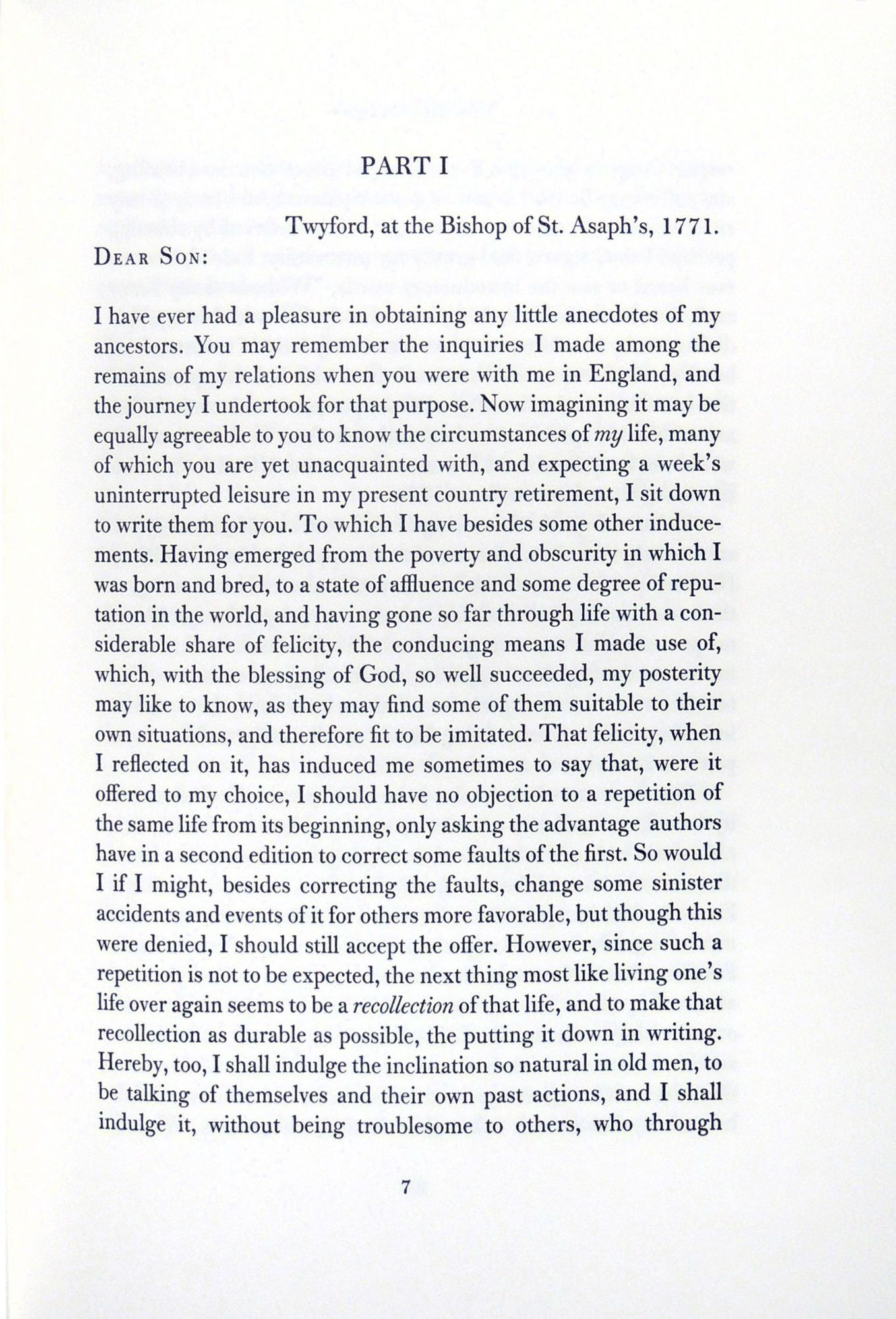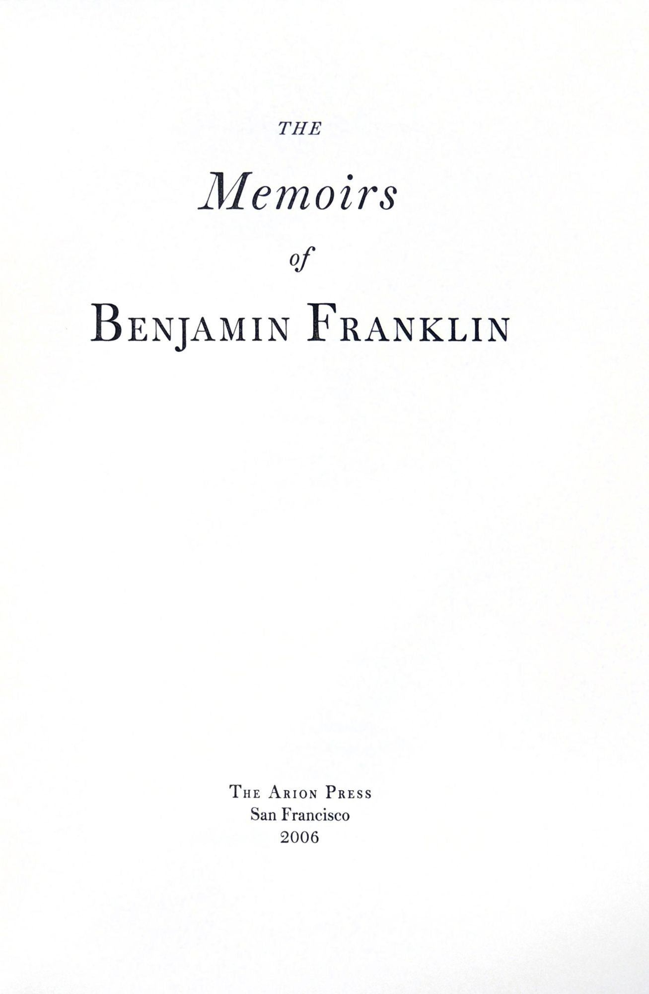 San Francisco: Arion Press, 2006. Hardcover. Fine. Hardcover. Number 293 of 400 numbered copies for sale, with 26 lettered copies printed for complimentary distribution. This title was printed in celebration of the three-hundredth anniversary of the birth of Benjamin Franklin. The work was more commonly known as the Autobiography, but it was published here under the title Franklin himself used in referring to his manuscript. Unpublished at the time of his death, it has since become the most widely read memoir of all time. The prospectus continues to describe the mysterious path of the memoirs. considered lost for several decades after Franklin's death, and not published from his original manuscript until it was discovered by John Bigelow, the American minister to France in that country in 1867. Despite his many achievements during his illustrious life, Franklin asked to be remembered as a printer. The inscription he wrote for his tombstone reads: "B. Franklin, Printer." He believed in the trade of printing as indispensable to the spread of knowledge and self-governance. It seemed fitting to the Arion Press proprietor, Andrew Hoyem, that an American printer celebrates the three hundredth anniversary of Franklin's birth with a new design and printing of the Memoirs.