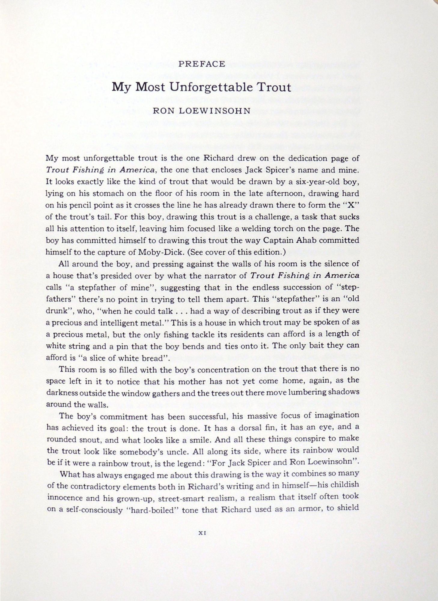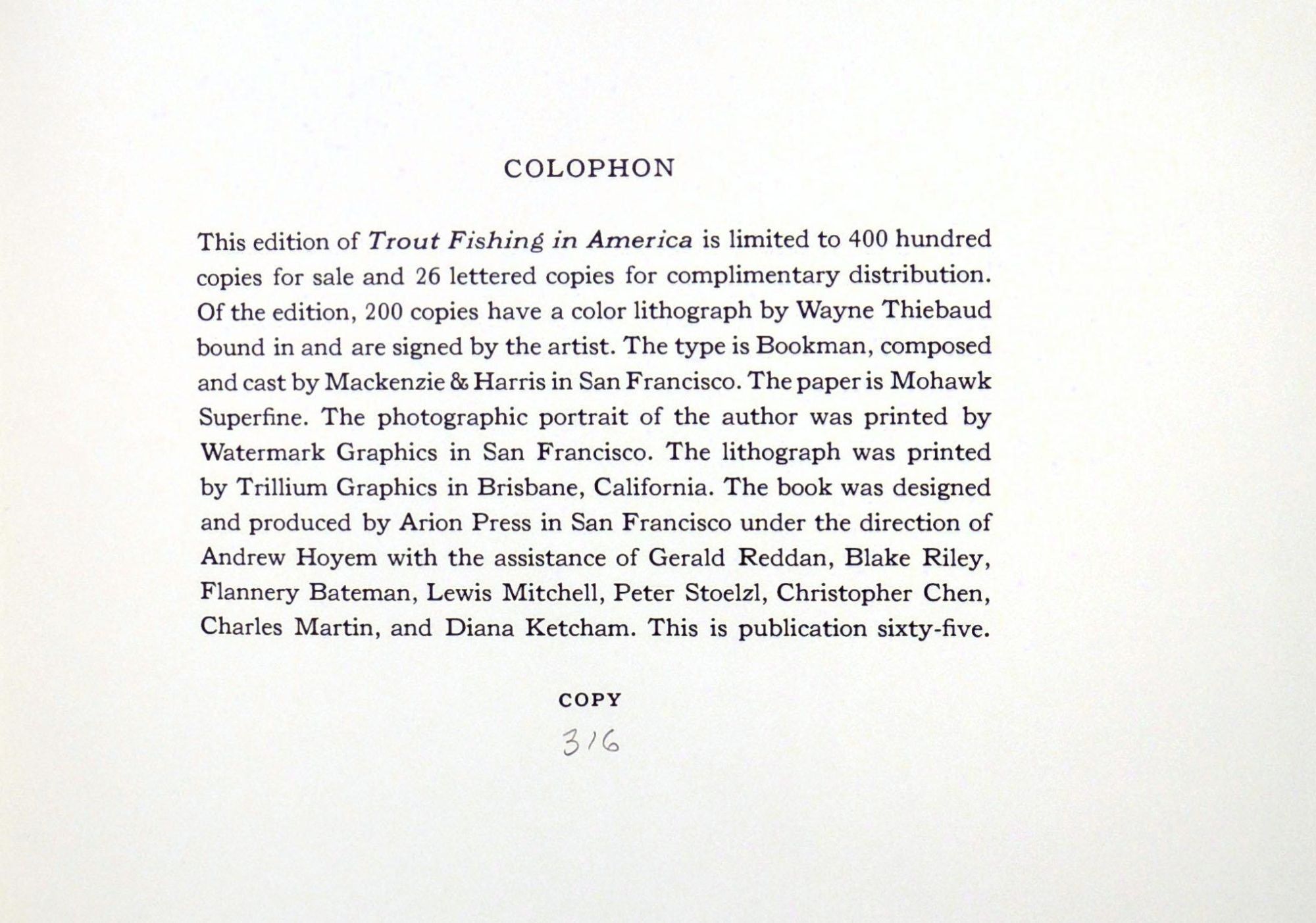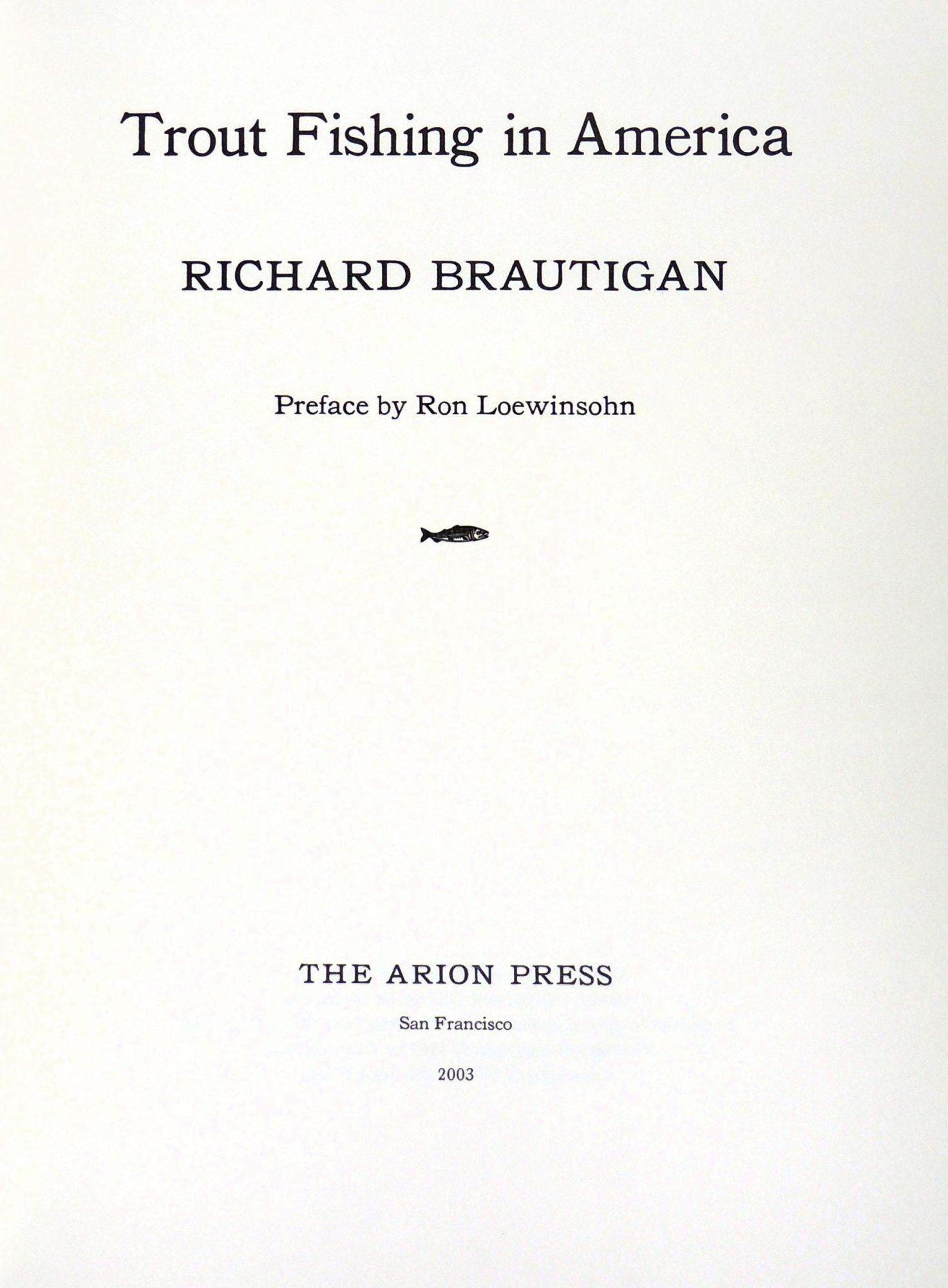 San Francisco: Arion Press, 2003. Hardcover. Fine. Hardcover. Number 316 of 400 copies. Of the edition, 200 copies have a color lithograph by Wayne Theibaud signed by the artist. This copy is the standard edition and does not have the lithograph. Brautigan's early book, published in 1967 became an instant cult classic. Richard Brautigan was a literary idol of the 1960s and '70s who came of age during the heyday of Haight-Ashbury and whose comic genius and iconoclastic vision of American life caught the imaginations of young people everywhere. Called “the last of the Beats,” his early books became required reading for the hip generation, and on its publication Trout Fishing in America became an international bestseller. The book was designed and produced by the Press under the direction of Andrew Hoyem. In the prospectus, Hoyem describes is long friendship with Brautigan and how this book came to be published by his press. It is bound in gray cloth with a blue cloth backing with title in black to spine. The title and author name along with a whimsical illustration of a fish are on the front cover. Printed in Bookman type on Mohawk Superfine paper. The photographic portrait of the author was printed by Watermark Graphics in San Francisco. Accompanied by the prospectus. In fine condition. Measures 7.25 x 10 inches. 124 pages. PRI/103024.