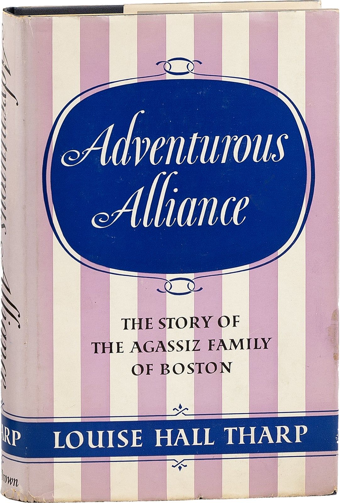 Boston: Little, Brown & Company, 1959. First Edition. First Printing. Octavo (21.5cm); navy blue cloth-covered boards, with titling and decoration stamped in gilt on spine; dustjacket; [xiv],[3],4-354pp. Inscribed on front endpaper, "For / Dorothy Cooney / best wishes / Sincerely, / Louise Hall Tharp". Spine-wear, foxing at edges of textblock, finger-soil at lower edge of textblock; Near Fine. Dustwrapper unclipped (priced $5.00) with mild external wear; Very Good+. Biography explores backgrounds, obstacles, professional lives, and love between Louis Agassiz, a Swiss naturalist, and Elizabeth Cary, of Boston. [82578].