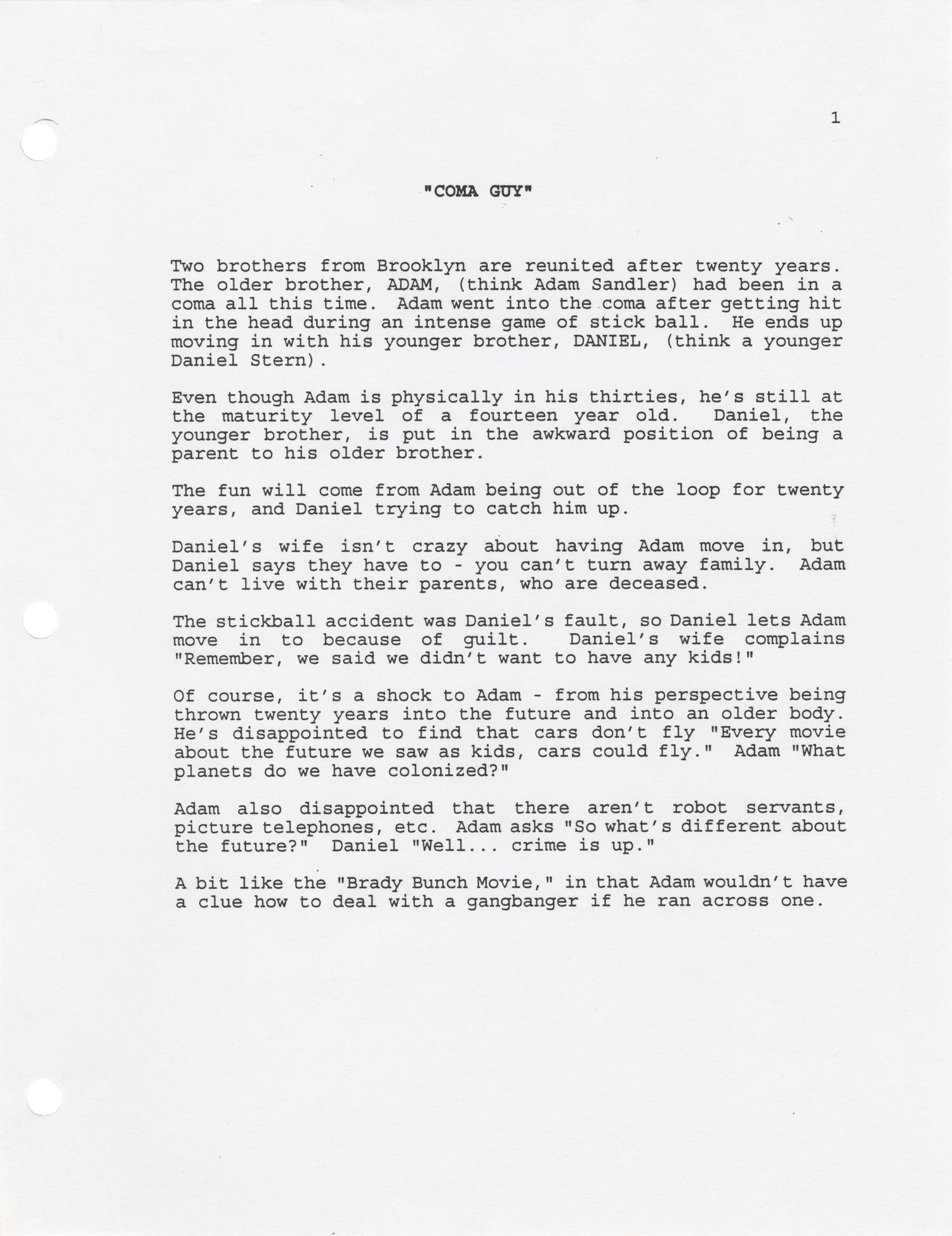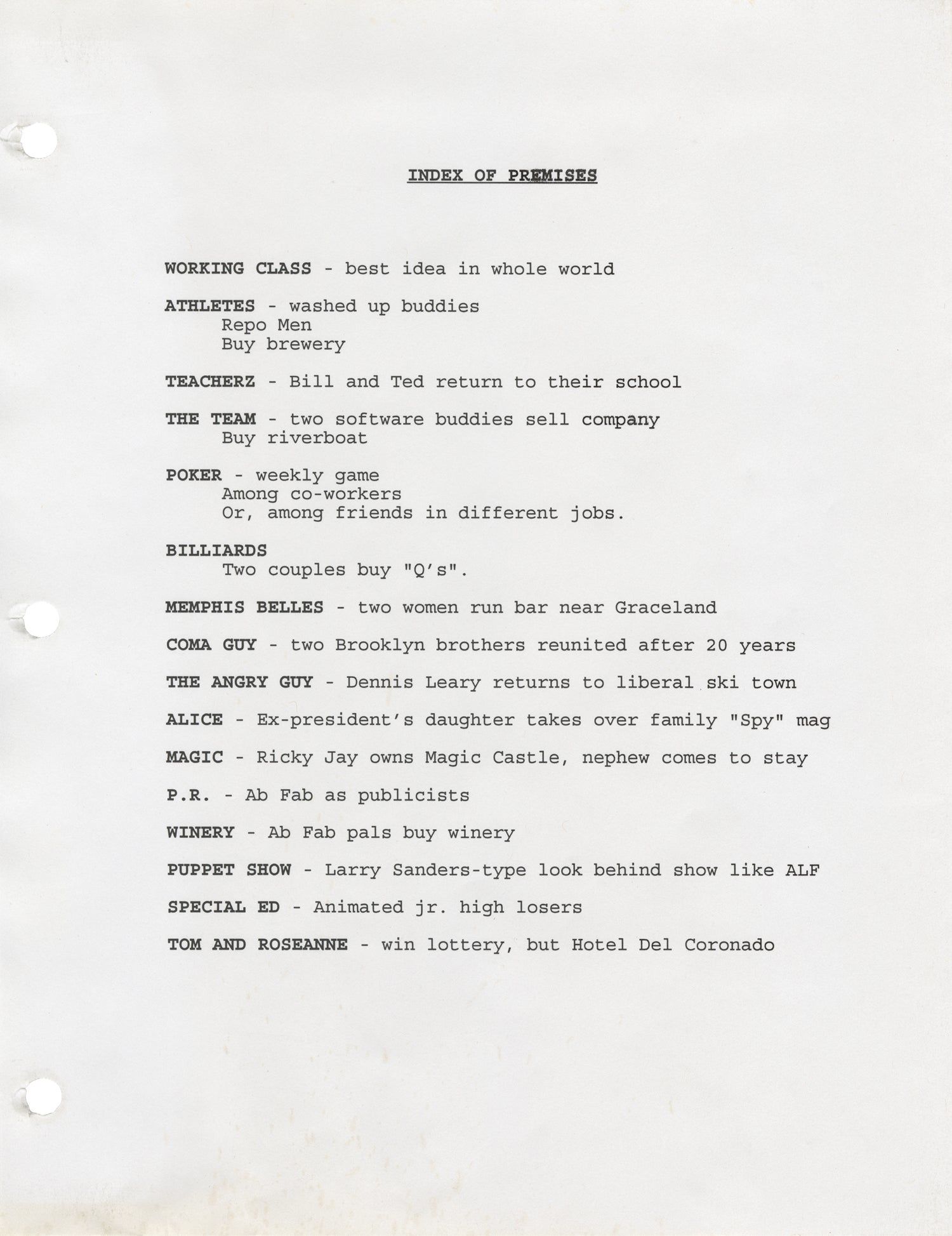 N.p.: N.p., 1995. Archive of vintage treatments and proposals for 16 unproduced sitcom television series. All material housed together in a generic three-ring binder, with a manuscript label on the binder spine, noting "1995 Pilot Pitches," in the hand of screenwriter Stephen Sustarsic.