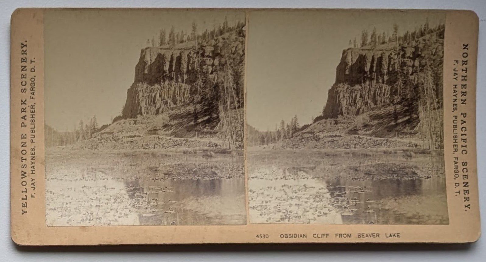 Fargo, D.T. [Dakota Territory]: F. Jay Haynes, 1889. [4000 Series]. Photograph. Very Good. Stereoview photograph on a tan Northern Pacific Scenery / Yellowstone Park Scenery mount [9 cm x 18 cm]. Title printed in black at bottom margin beneath right image. Mild age toning and smudging around edges of mount, image gently faded. A nice view of Beaver Lake in the foreground with Obsidian Cliff prominently rising in the background to the right.