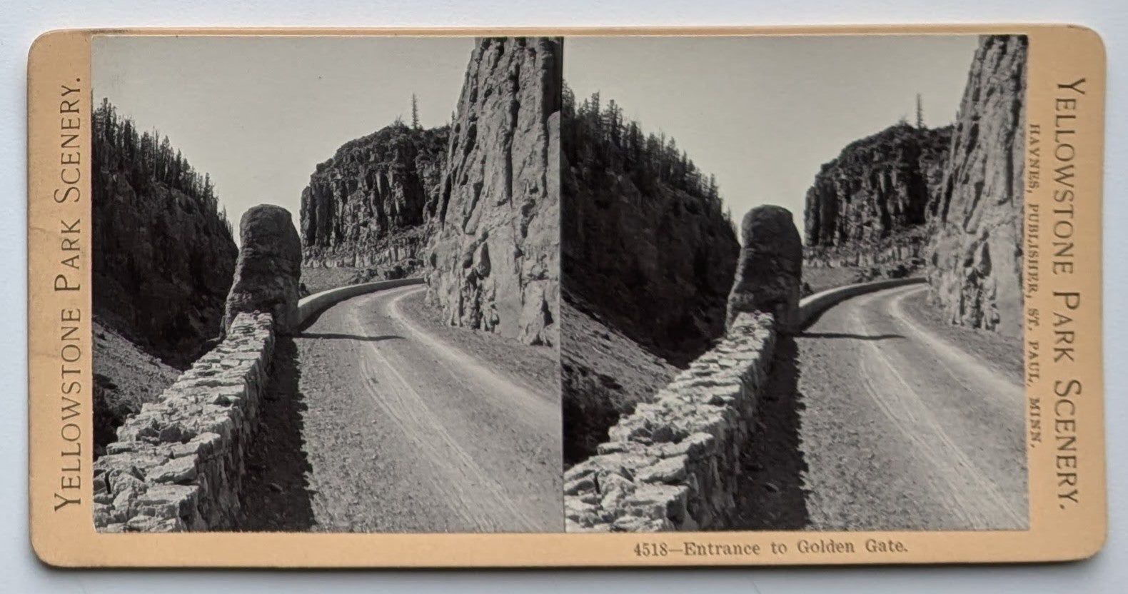 St. Paul, Minn: Haynes, Publisher, 1900. [4000 Series]. Photograph. Near Fine. Stereoview photograph on a tan Yellowstone Park Scenery mount [9 cm x 18 cm]. Title printed in black at bottom margin beneath right image. A view into Golden Gate from its eastern entrance upon the paved road/bridge curving to the right along the steep rock wall. The well-known thumb shaped rock formation stands at the left side of the road.