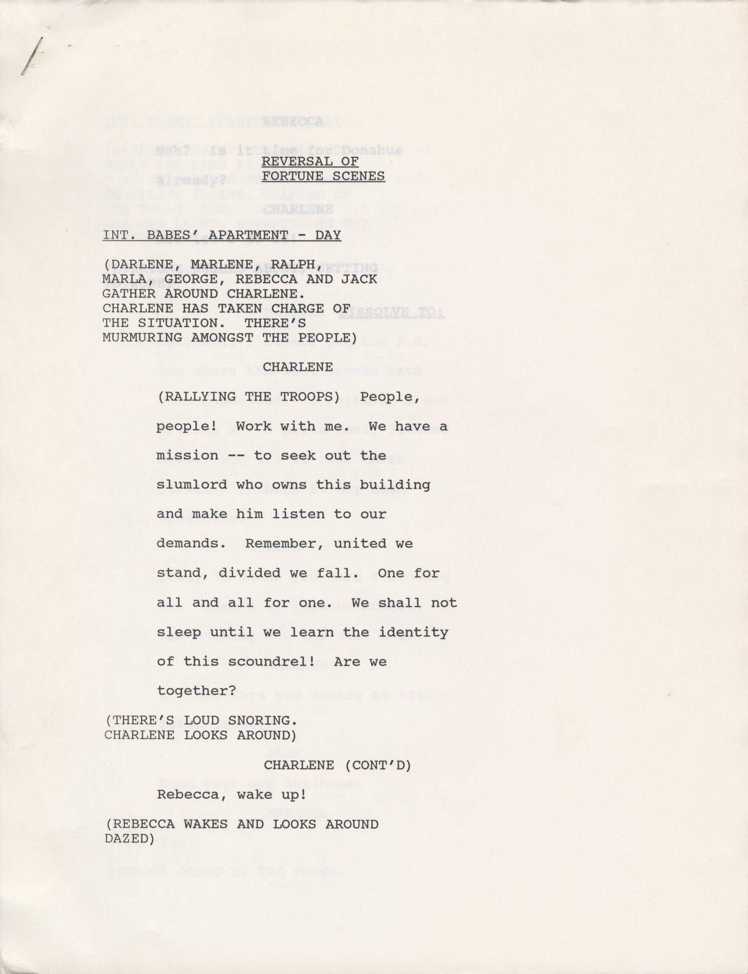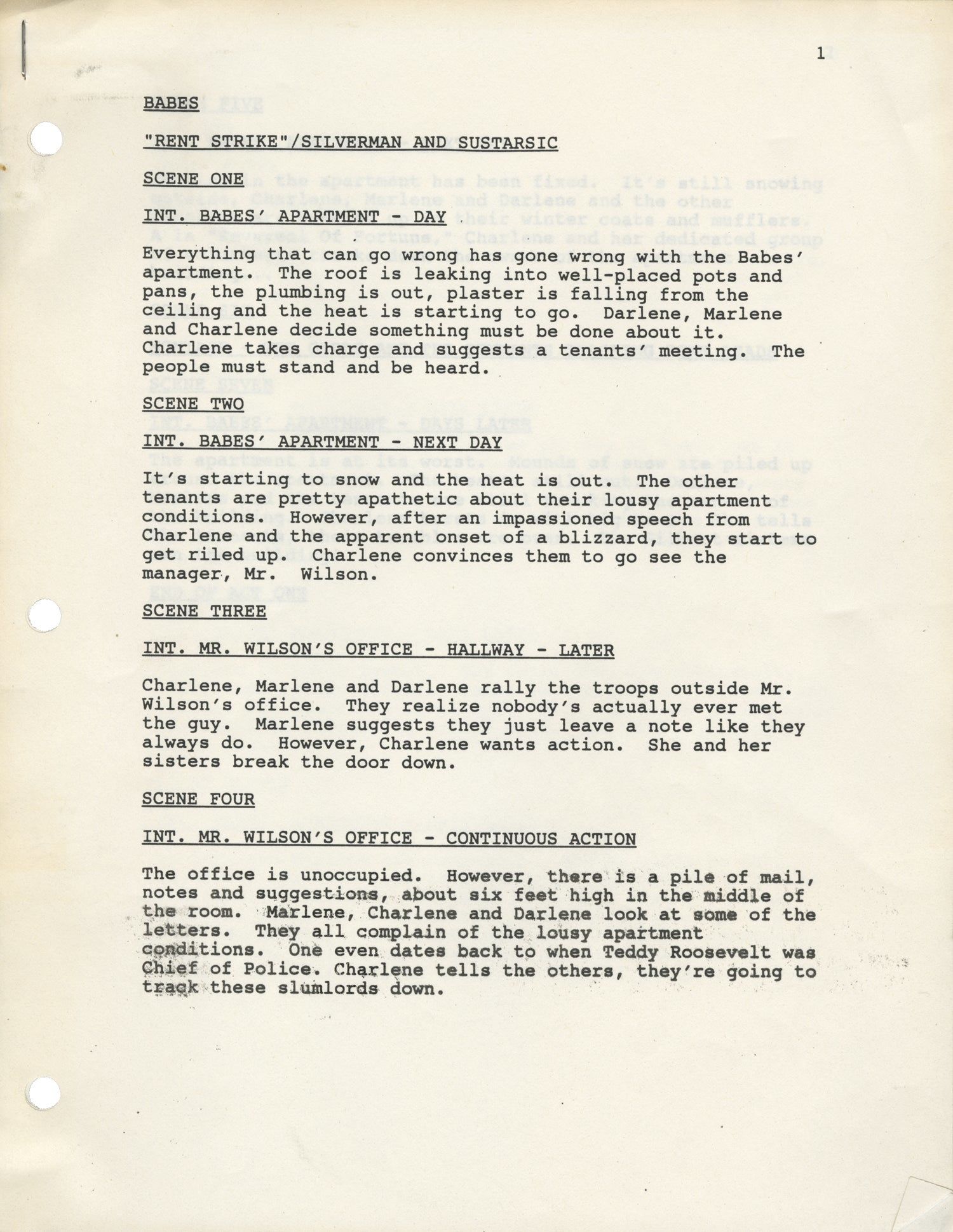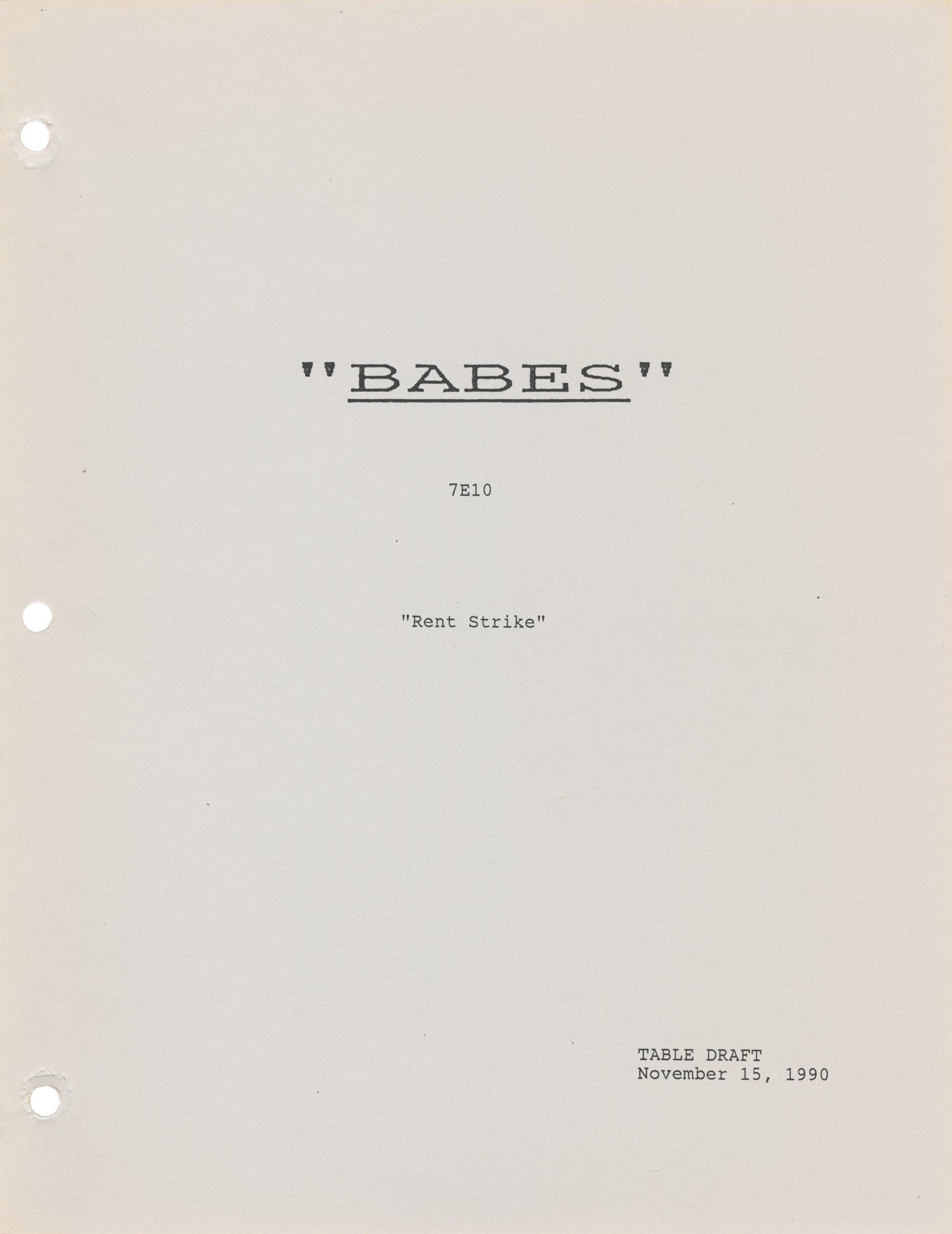 Archive includes a treatment script, a First Draft, a Second Draft, a Final Draft, a Shooting Draft, and a Revised Shooting Draft for Season 1 Episode 2 ("Everything But Love"); a treatment script, a First Draft, a Table Draft, and a Final Draft for Season 1 Episode 11 ("Rent Strike"); and a Final Draft for Season 1 Episode 17 ("Mom"). Additionally included is a treatment script for an unproduced episode, titled "Reversal of Fortunes."