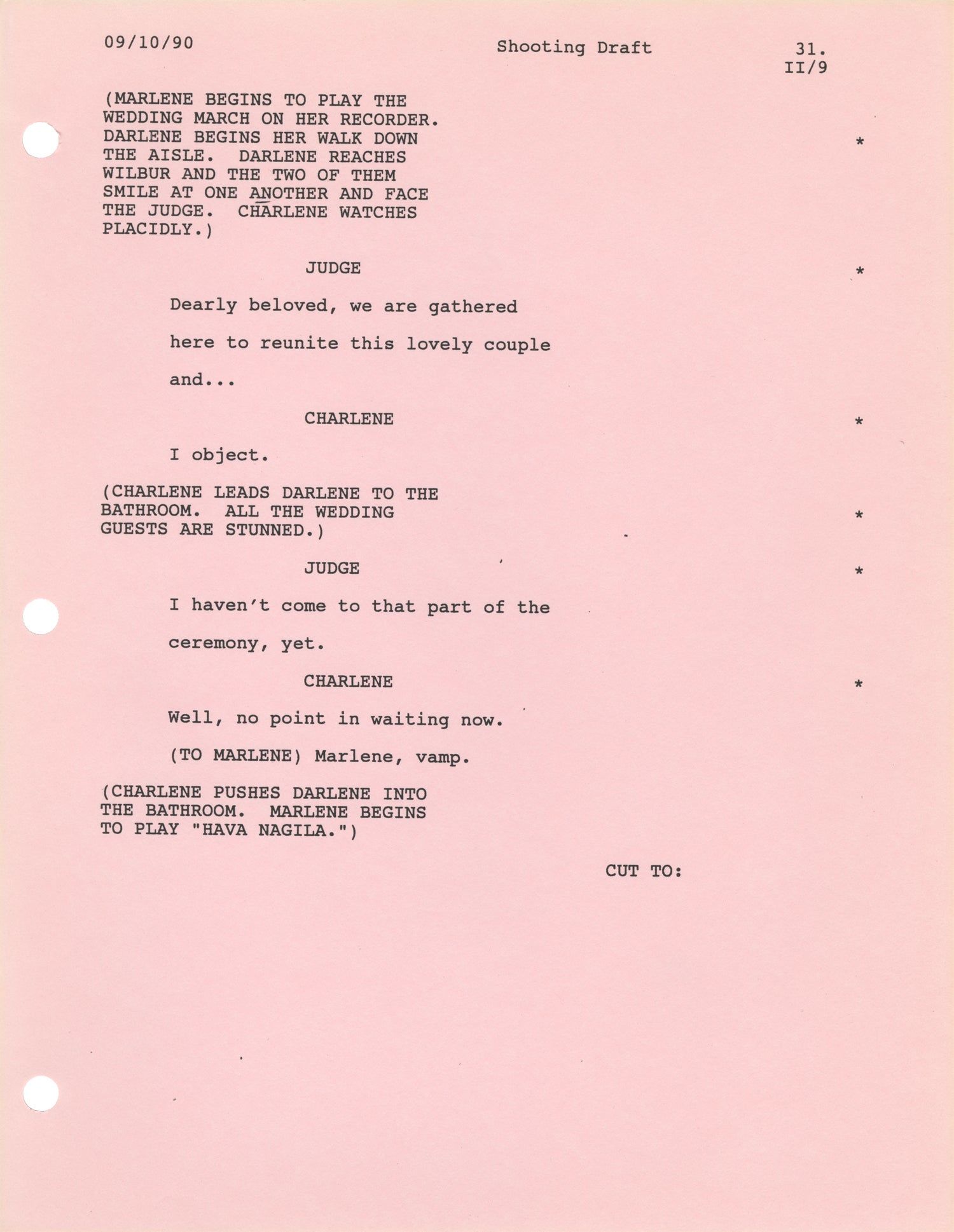Pink titled wrappers, dated November 19, 1990, on the front wrapper, noted as FINAL DRAFT. Title page present, dated November 19, 1990, noted as TABLE DRAFT, with credits for Silverman, Sustarsic, and Murray. 57 leaves, with last page of text numbered 47. Xerographic duplication, rectos only. Pages Near Fine, wrapper Near Fine.