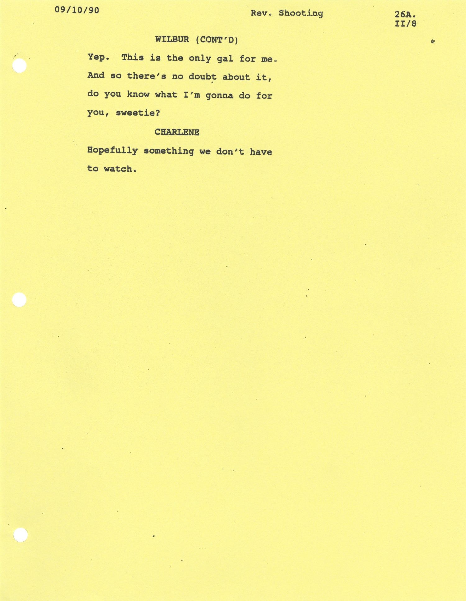 Blue titled wrappers, dated September 8, 1990, on the front wrapper, noted as SHOOTING DRAFT. Title page present, dated September 8, 1990, noted as Shooting Draft, with credits for Silverman and Sustarsic. 52 leaves, with last page of text numbered 44. Xerographic duplication, rectos only, with a single pink revision page dated 9/10/90. Pages Near Fine, wrapper Near Fine.