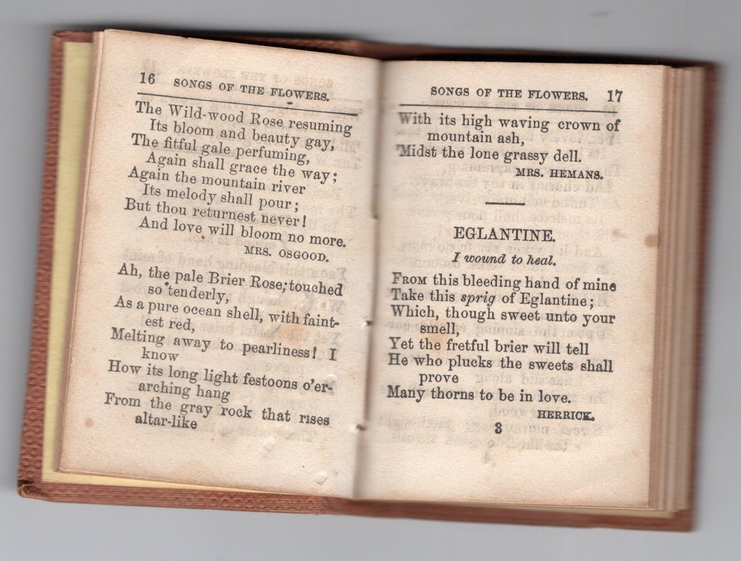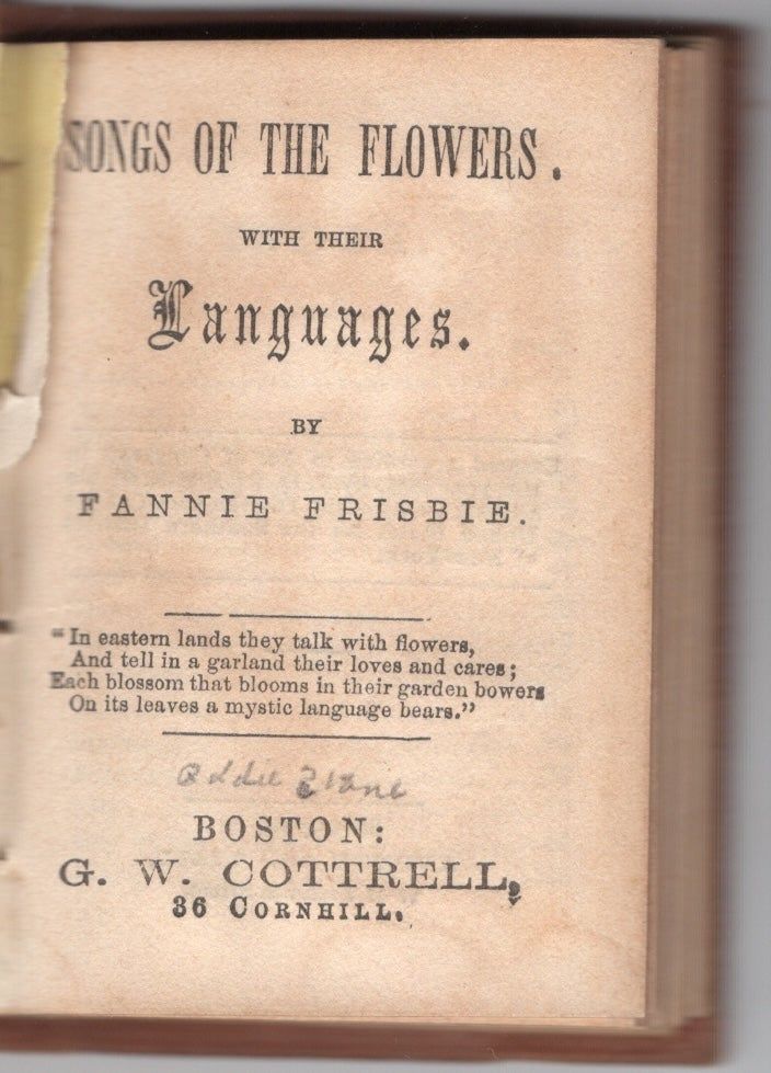A 96pp. gilt stamped hardcover book. 64 mo.. Boston: G. W. Cottrell. 1855. Verse on title page begins “In eastern lands they talk of flowers, And tell in a garland their loves and cares”... Thirty-one (31) different flowers represented; all in rhyming verse. Interesting interpretation. Condition: front flyleaf lacking. Toning throughout.