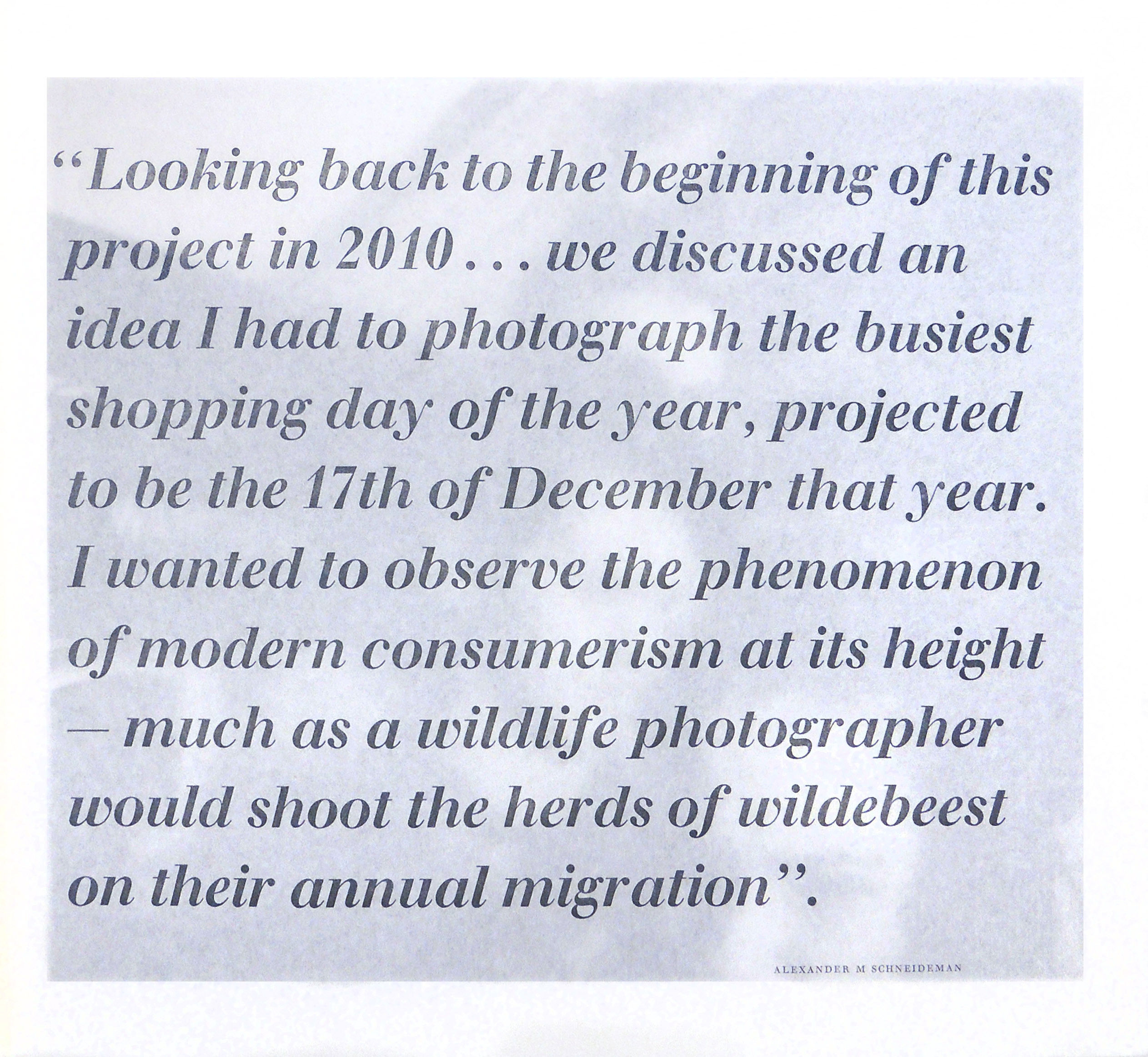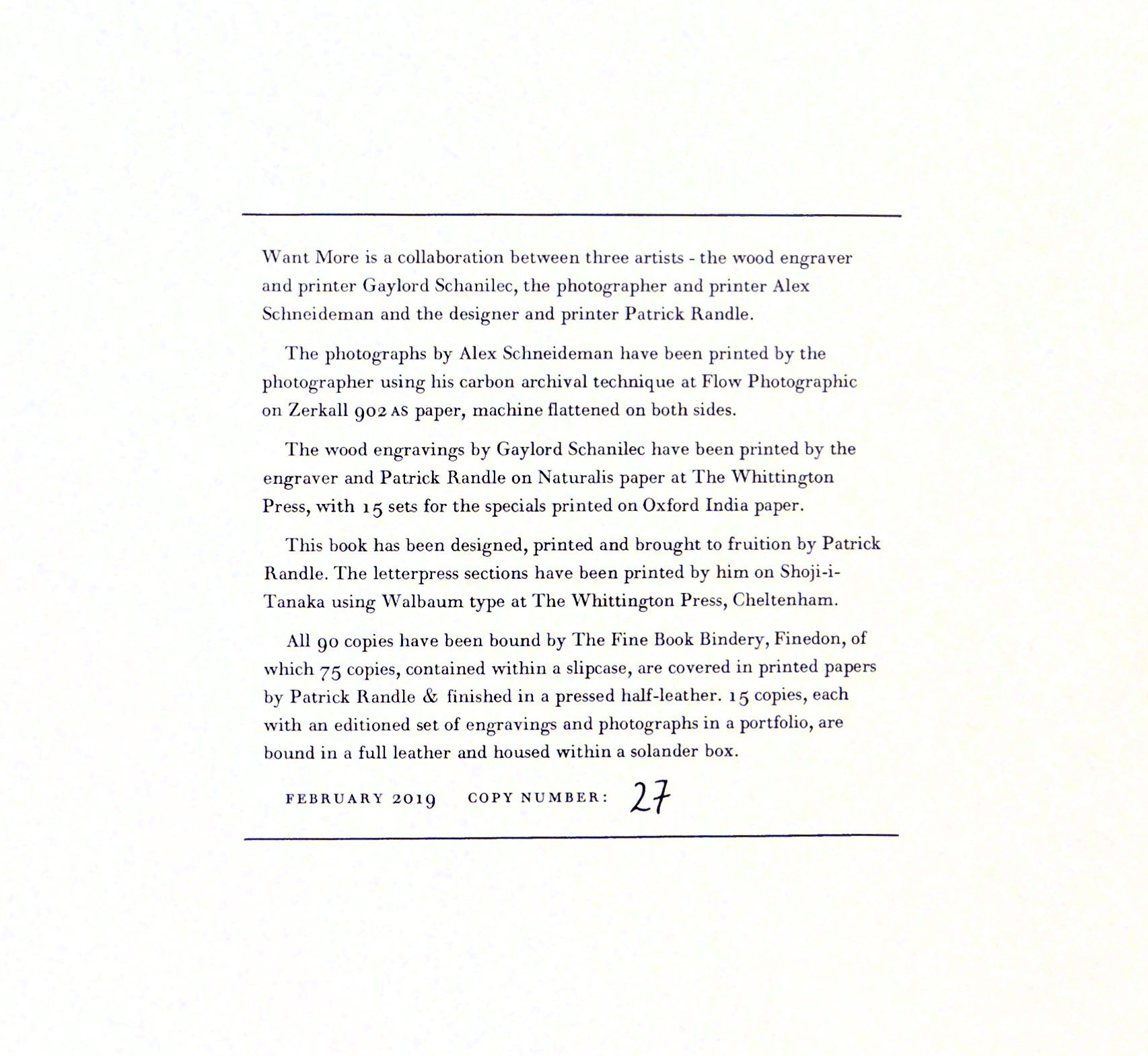 London: Golborne Editions, 2019. Hardcover. Fine. Hardcover. Number 27 of 75 copies within a slipcase, covered in printed papers by Patrick Randle, and finished in a pressed half leather. An additional 15 copies were issued with an editioned set of engravings and photographs in a portfolio and bound in full leather. This remarkable book is about the collaboration of three master artists, Schanilec, Schneideman, and Randle. It was printed at Randle's Whittington Press for Golborne Editions. The idea for this work first appeared in 2010 during conversations between Schanilec and Schneideman on consumerism and its effects on people and society. The photographs were taken over several years and images were regularly sent to Schanilec to create his redefining of the documetary photograph with his marvelous wood engravings of the photos. The result was a total of 13 photographs decided upon to use and the resultant engravings. The book's format for each is an image of Schanilec's interpretation of the photograph followed by the black and white photograph itself. Interspersed are texts by Schneieman and Schanilec with their thoughts about the project and some of the communications they exchanged. The result is a fascinating yet troubling discourse on consumerism and commercialism.