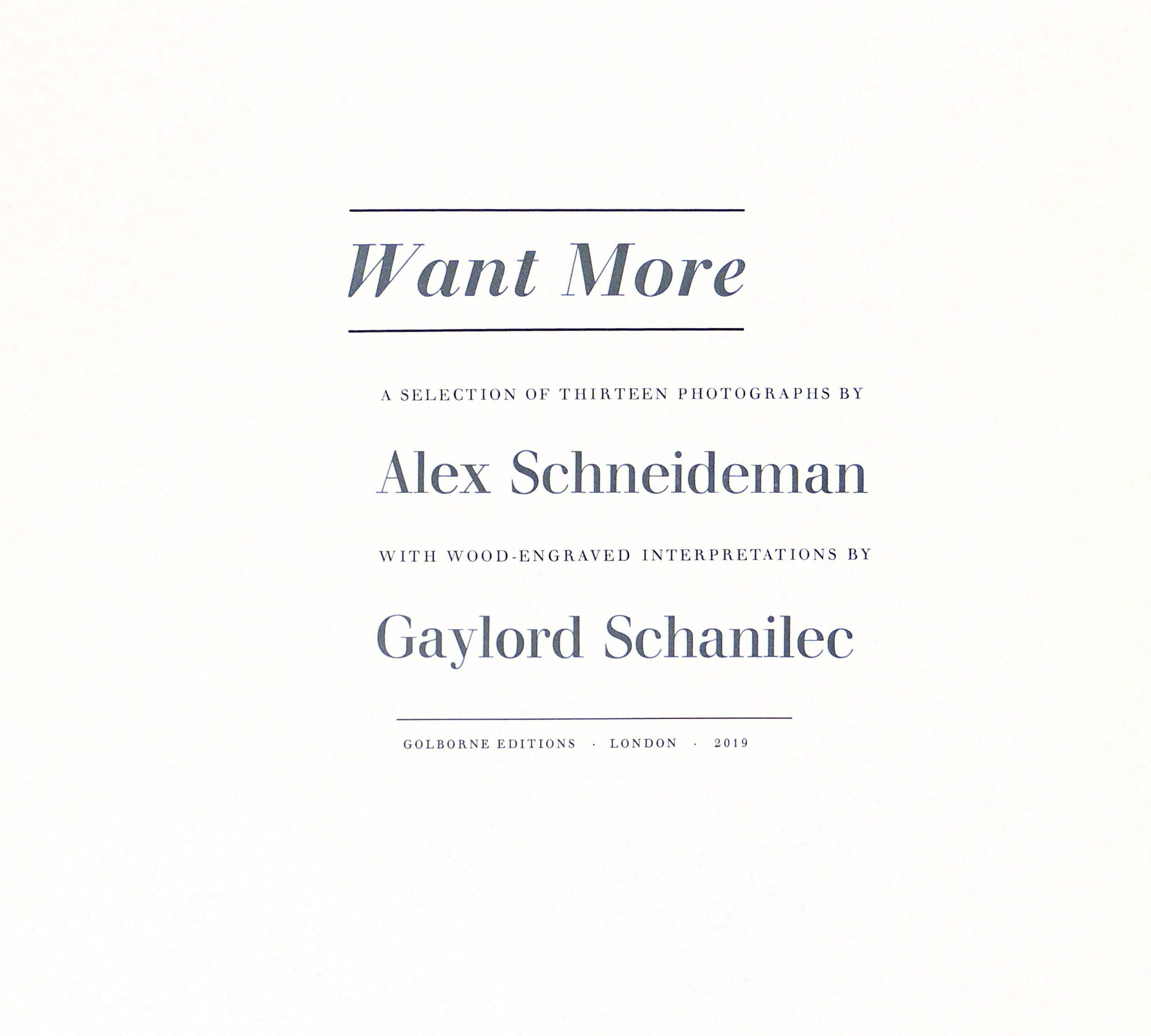 Want More: A selection of thirteen photographs by Alex Schneideman with wood-engraved interpretations by Gaylord Schanilec