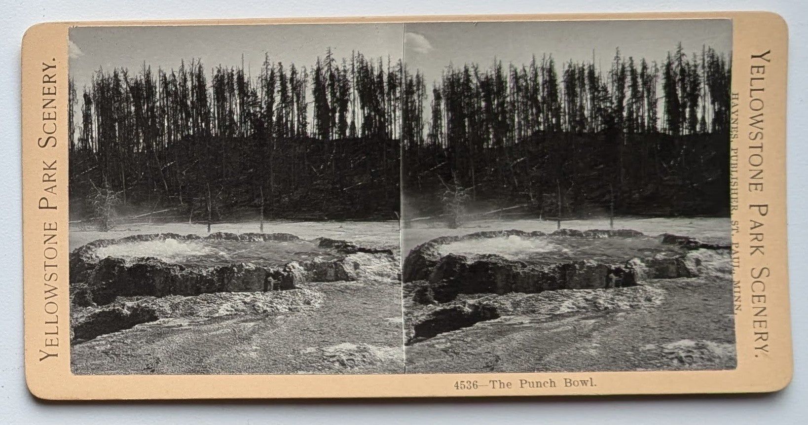 St. Paul, Minn: Haynes, Publisher, 1900. [4000 Series]. Photograph. Near Fine. Stereoview photograph on a tan Yellowstone Park Scenery mount [9 cm x 18 cm]. Title printed in black at bottom margin beneath right image. Close view of the actively boiling "Punch Bowl" springs in front of a tall dark thicket of trees.