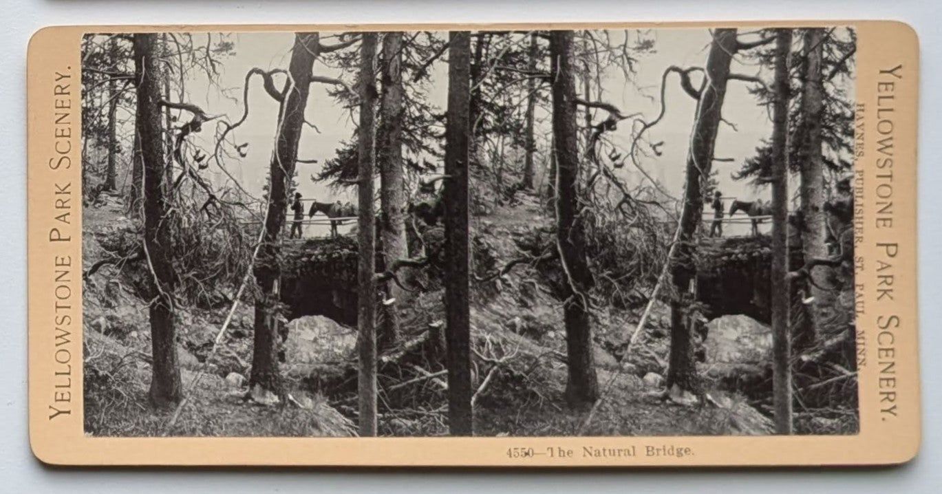 St. Paul, Minn: Haynes, Publisher, 1900. [4000 Series]. Photograph. Near Fine. Stereoview photograph on a tan Yellowstone Park Scenery mount [9 cm x 18 cm]. Title printed in black at bottom margin beneath right image. In this view, a man can be seen walking with a horse as they cross upon The Natural Bridge, foregrounded and framed by a tangle of trees.