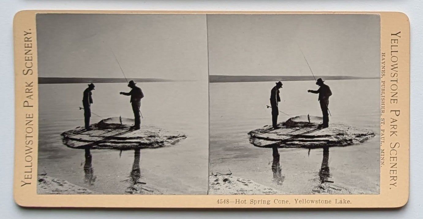 St. Paul, Minn: Haynes, Publisher, 1900. [4000 Series]. Photograph. Near Fine. Stereoview photograph on a tan Yellowstone Park Scenery mount [9 cm x 18 cm]. Title printed in black at bottom margin beneath right image. View shows stark silhouettes of two men in cowboy hats with fishing poles, standing upon a hot spring cone in Yellowstone Lake at dusk. A lovely image.