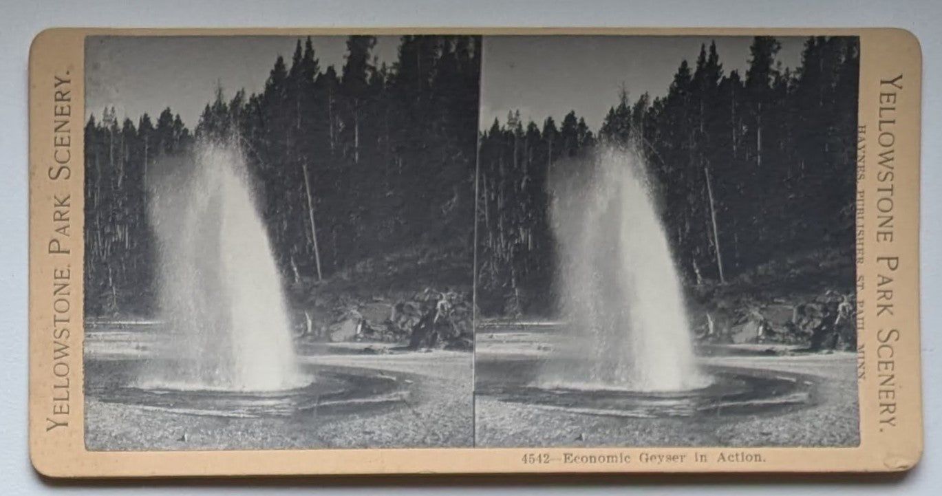 St. Paul, Minn: Haynes, Publisher, 1900. [4000 Series]. Photograph. Very Good +. Stereoview photograph on a tan Yellowstone Park Scenery mount [9 cm x 18 cm]. Title printed in black at bottom margin beneath right image. Light smudging and wear around the edges of the mount. Shows a close and centered image of the geyser erupting in front of the tall forest of pine nearby. Now dormant, this geyser earned the name 'economic' because the water it expelled upon eruption was mostly recollected back into its own vent.