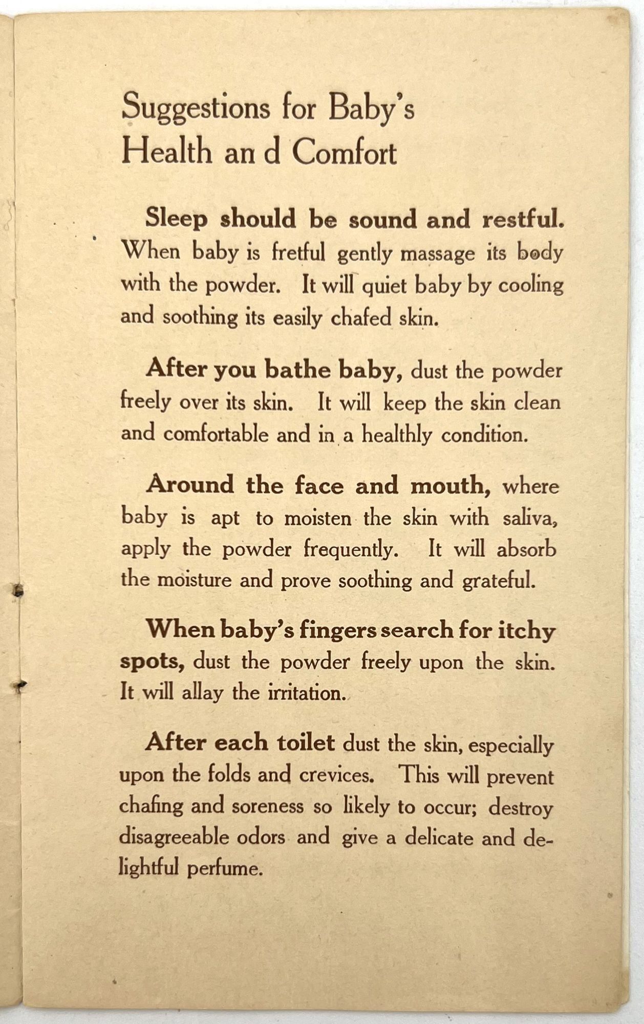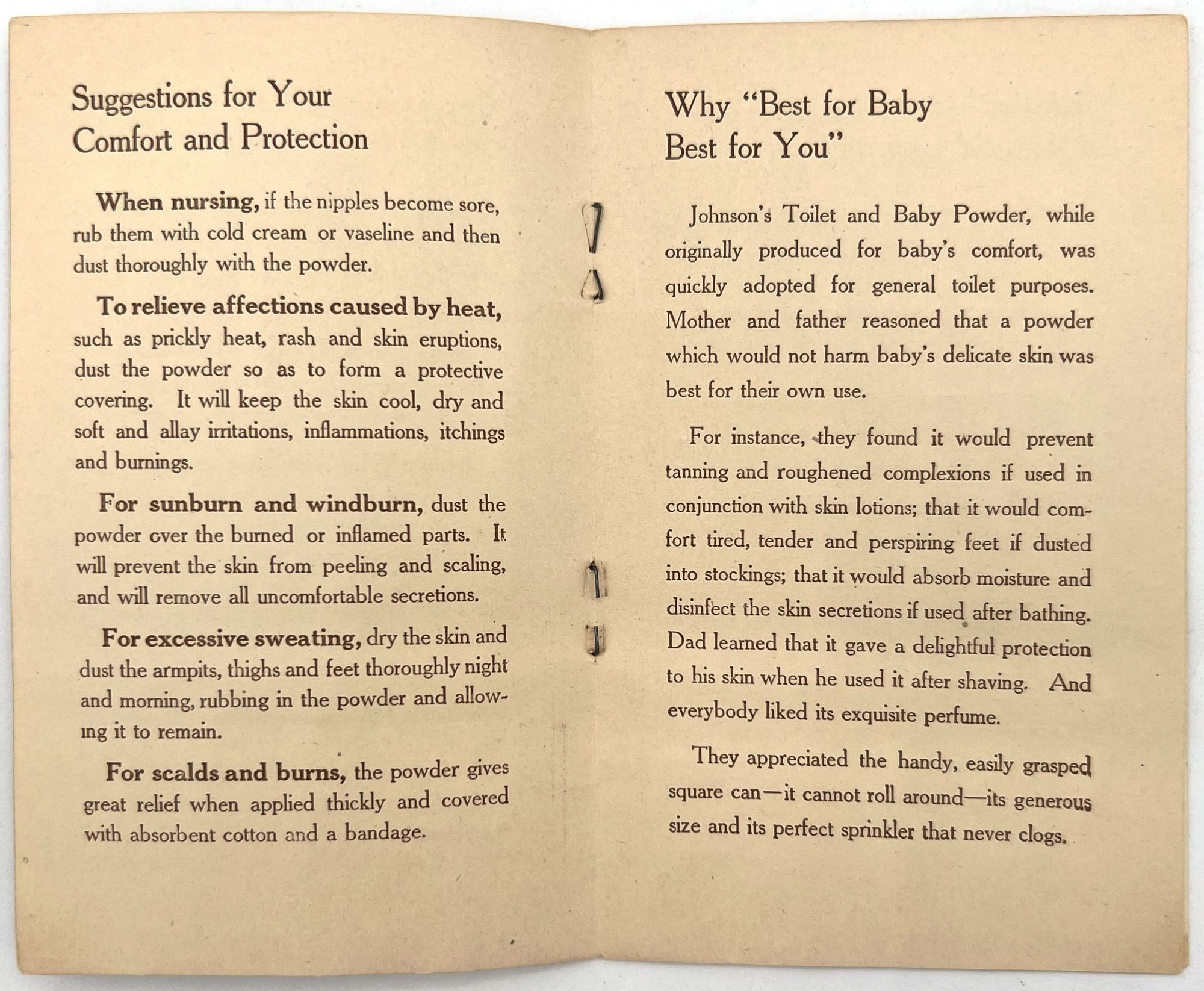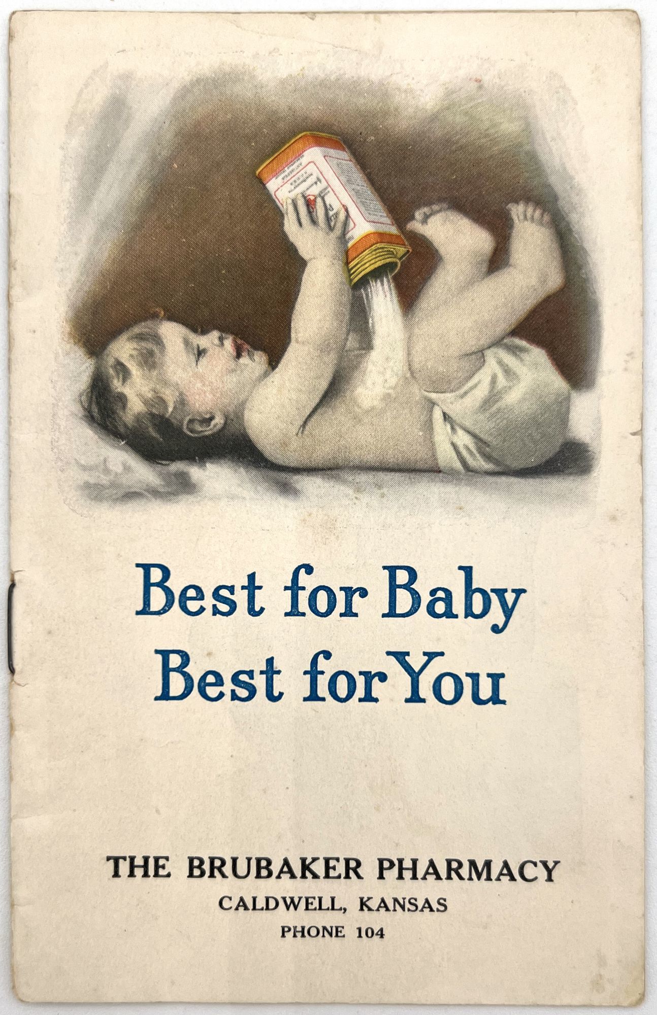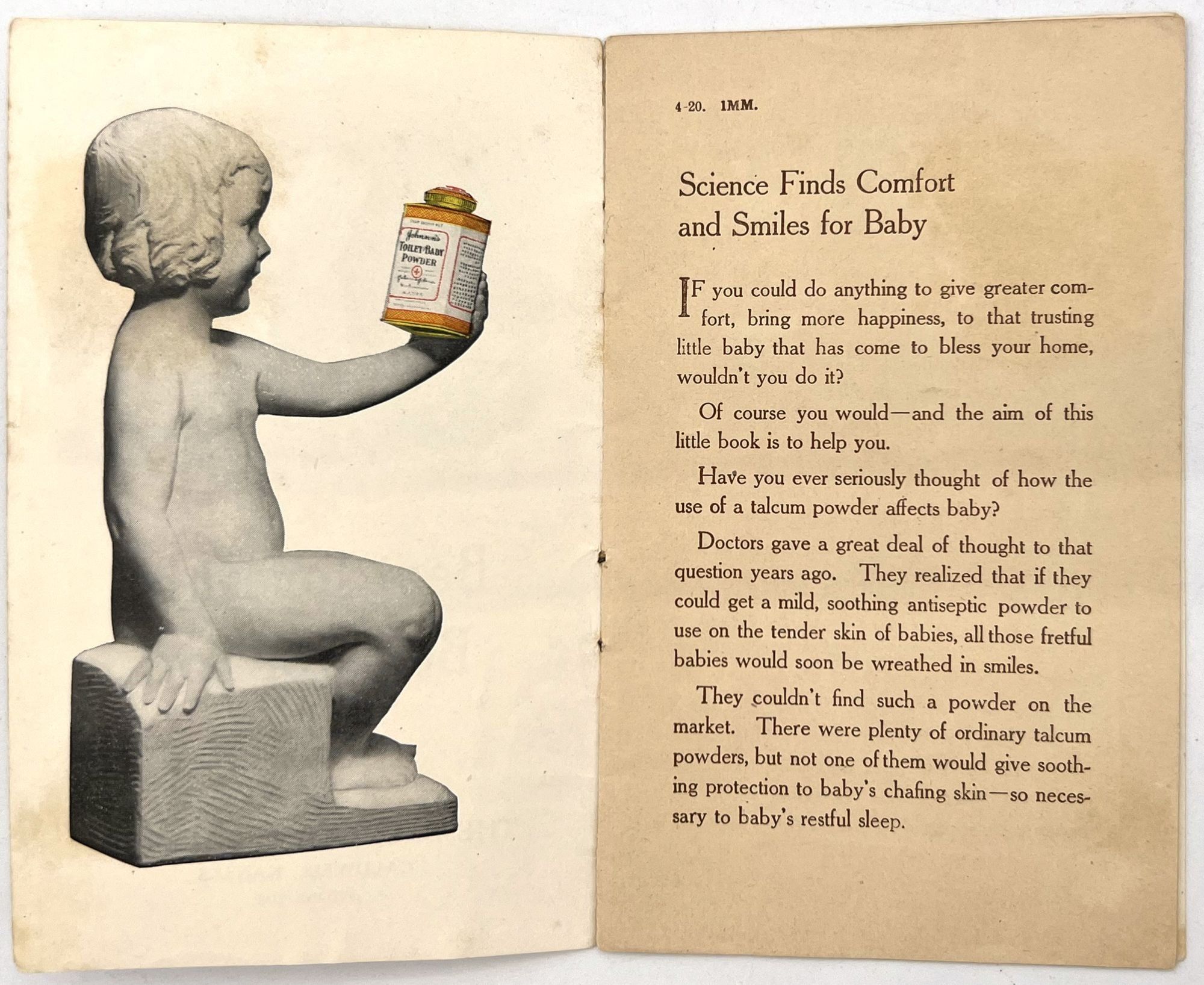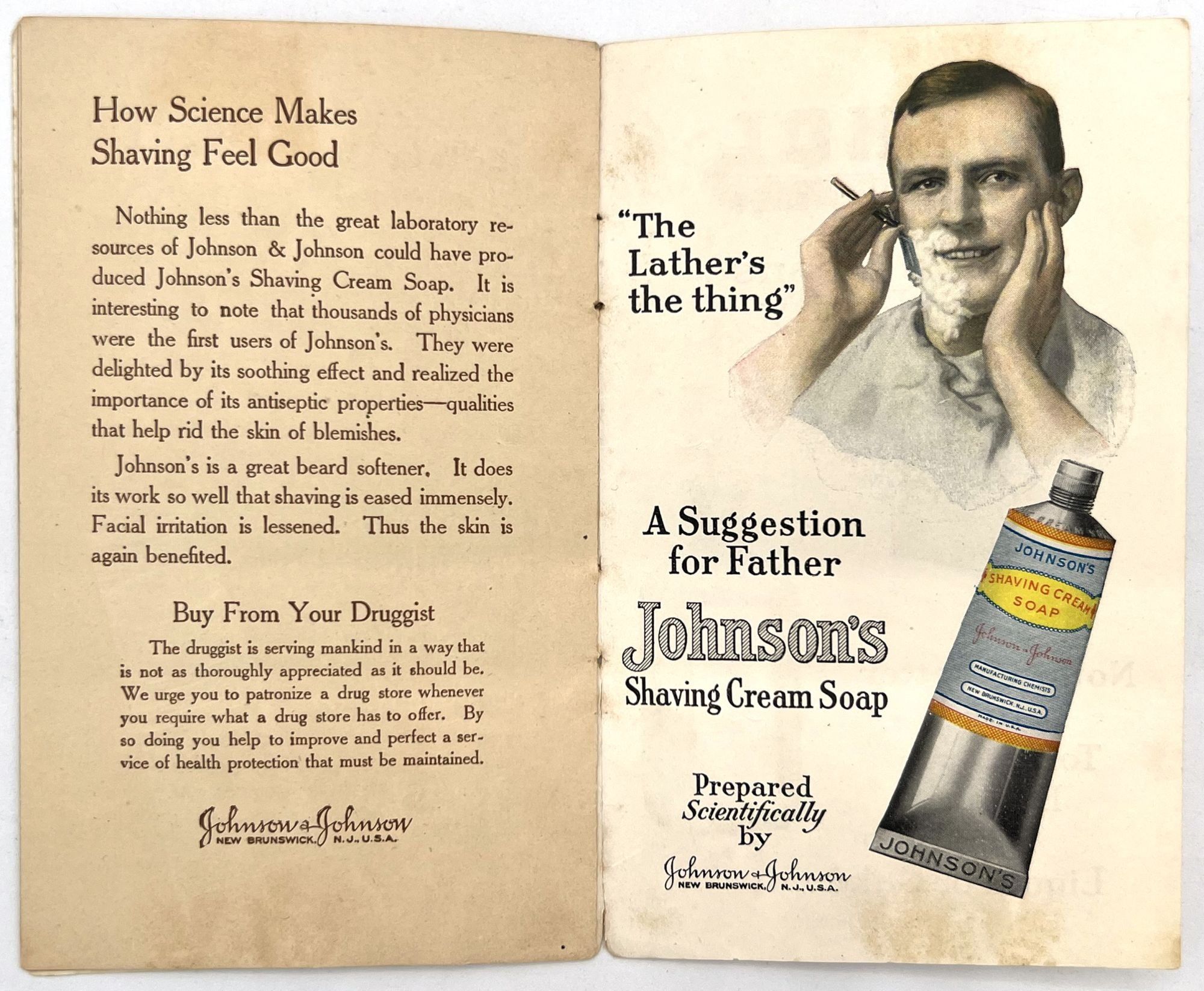 New Brunswick, New Jersey: Johnson & Johnson, 1910. Very good. Light dust soiling.. Science Finds Comfort and Smiles for Baby": a booklet advertising Johnson & Johnson products for infants and the whole family, offering parents tips on infant care (sound sleep, use baby powder, bathing, etc.). Also lists uses for the baby powder for mother (e.g. treating sore nipples from nursing, mild scalds and burns, etc.). Also advertises soaps and shaving cream. Sales agent (a Kansas pharmacy) printed on front wrapper. Interesting to see how companies advertised to families at the time. Single vol. (5.5" by 3.5"), pp. [12], in original illus. wrps with image of baby playing with baby powder on front.