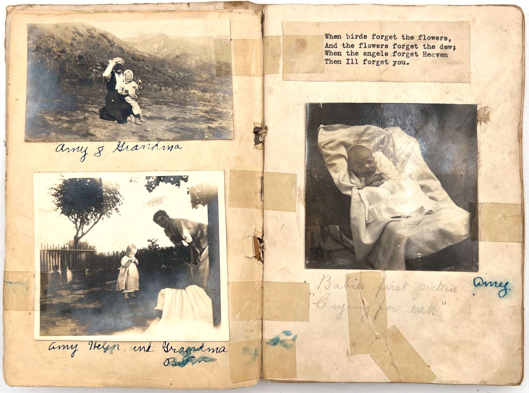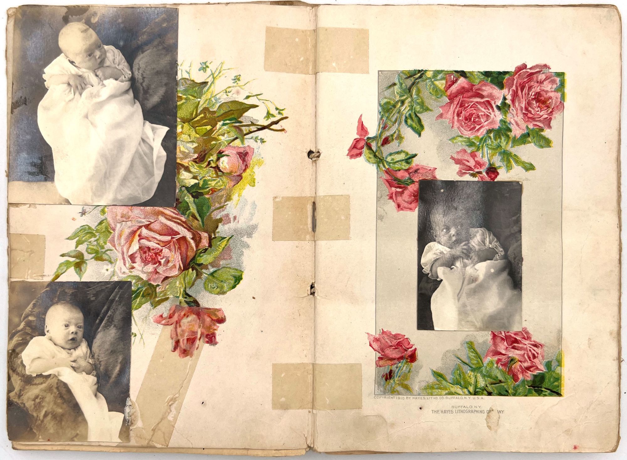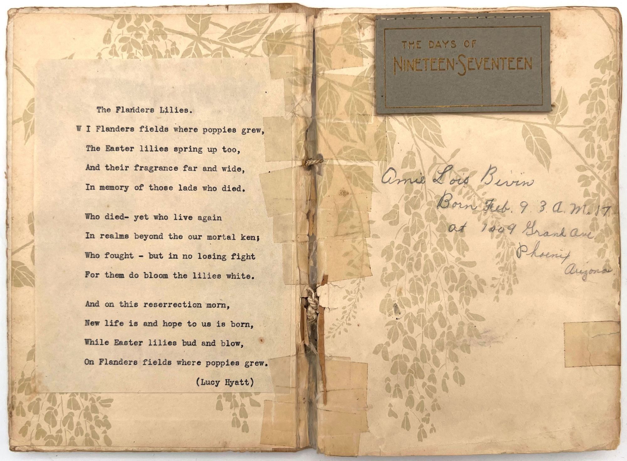 Two photos of the parents are included, as well as a family photo on the lower paste down. There is a newspaper clipping on the final leaf reporting on Amie's seventh birthday party, and a typewritten copy of the poem "The Flanders Lilies" by Lucy Hyatt-- grounding the book in the World War One era. Approx. half of the album has been utilized. 12mo (7.75" by 5.5"), 13 unnumbered leaves in original embossed and chromolithographed boards backed in cloth and reinforced with string.