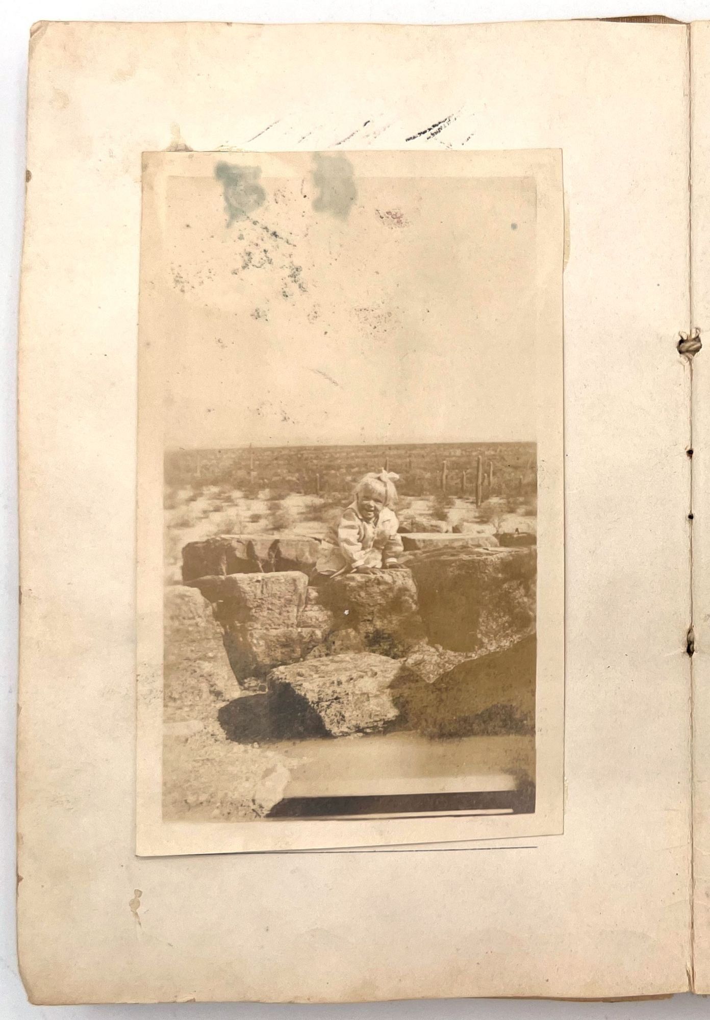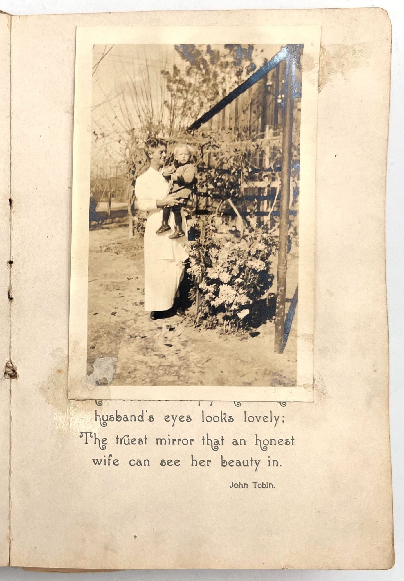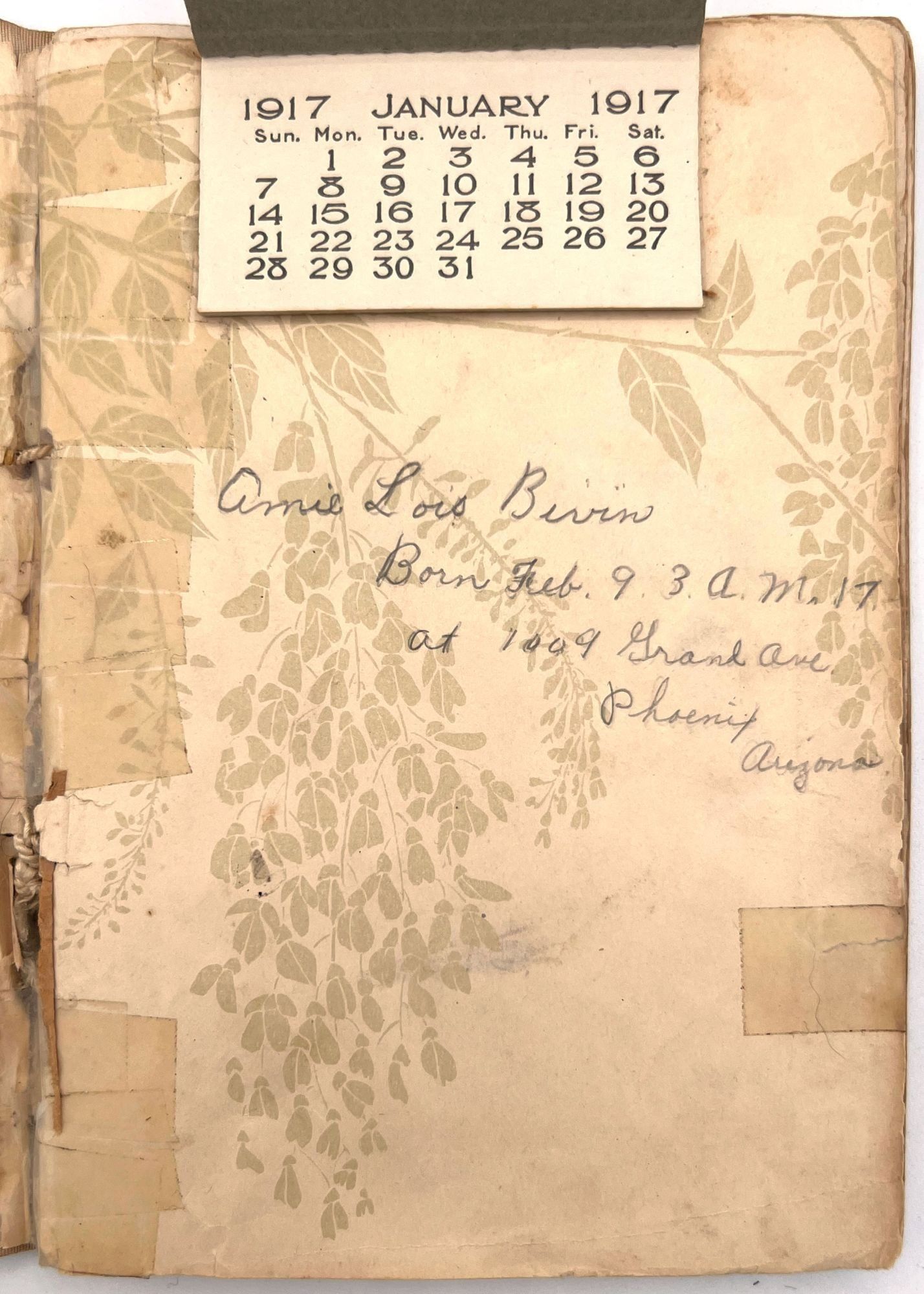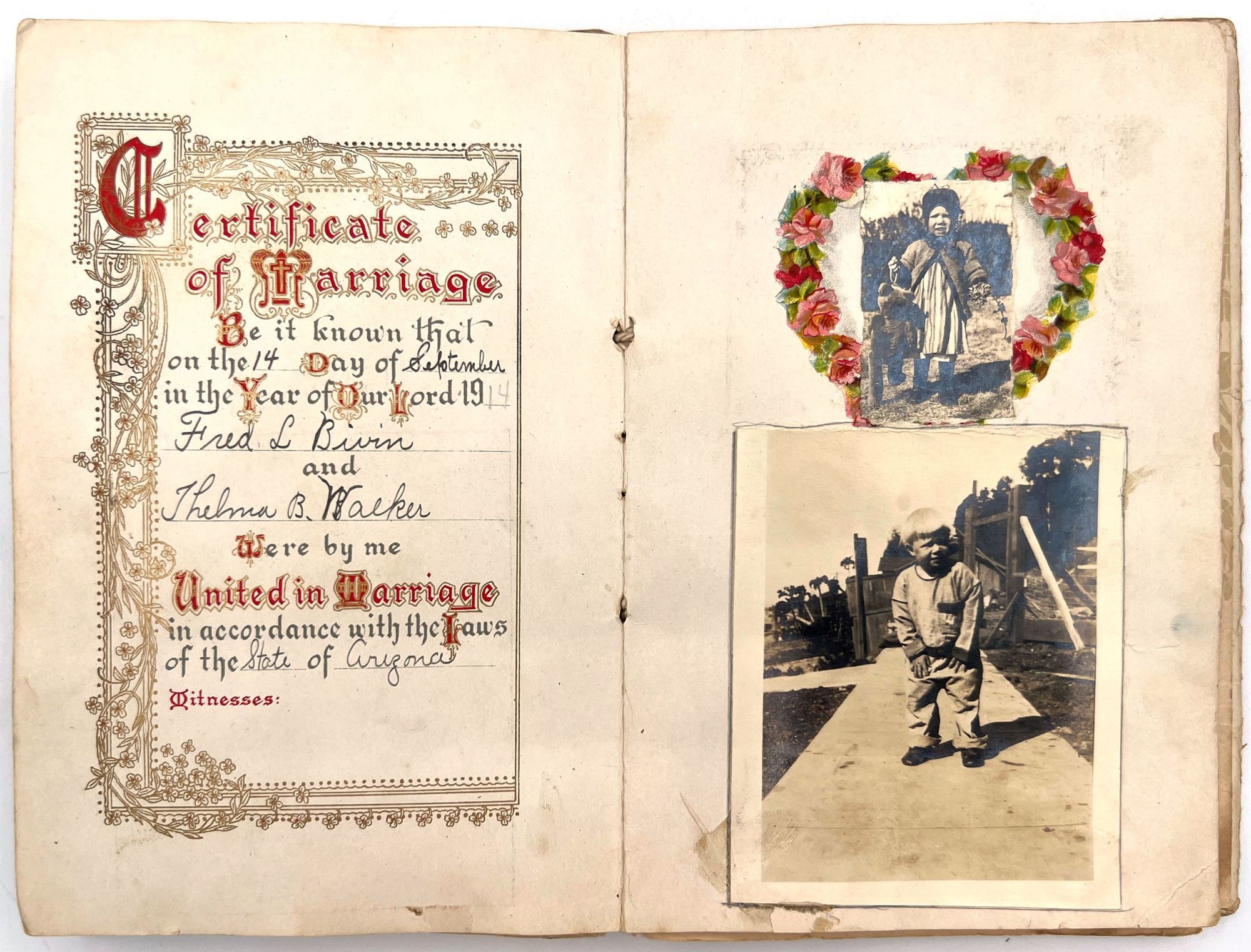 [Phoenix, Arizona], 1917. Fair to good. Worn with minor dust soiling, toning, short tears. Tape repairs throughout.. The baby book of Amie (a.k.a. Amy) Lois Bivin (b.1917) a pictorial history with twenty (20) original photographs, a small 1917 calendar, and scraps of typewritten verse. The album itself was published as a bridal book, complete with a faux certificate of marriage, filled out in ink by Amie's parents: Fred L. Bivin and Thelma B. Walker. The family lived in Phoenix, Arizona, and the photographs span Amie's development from birth to age seven. Points of information included in the book are: baby name; birth date, time, and location of birth; and the names of parents with location of marriage.