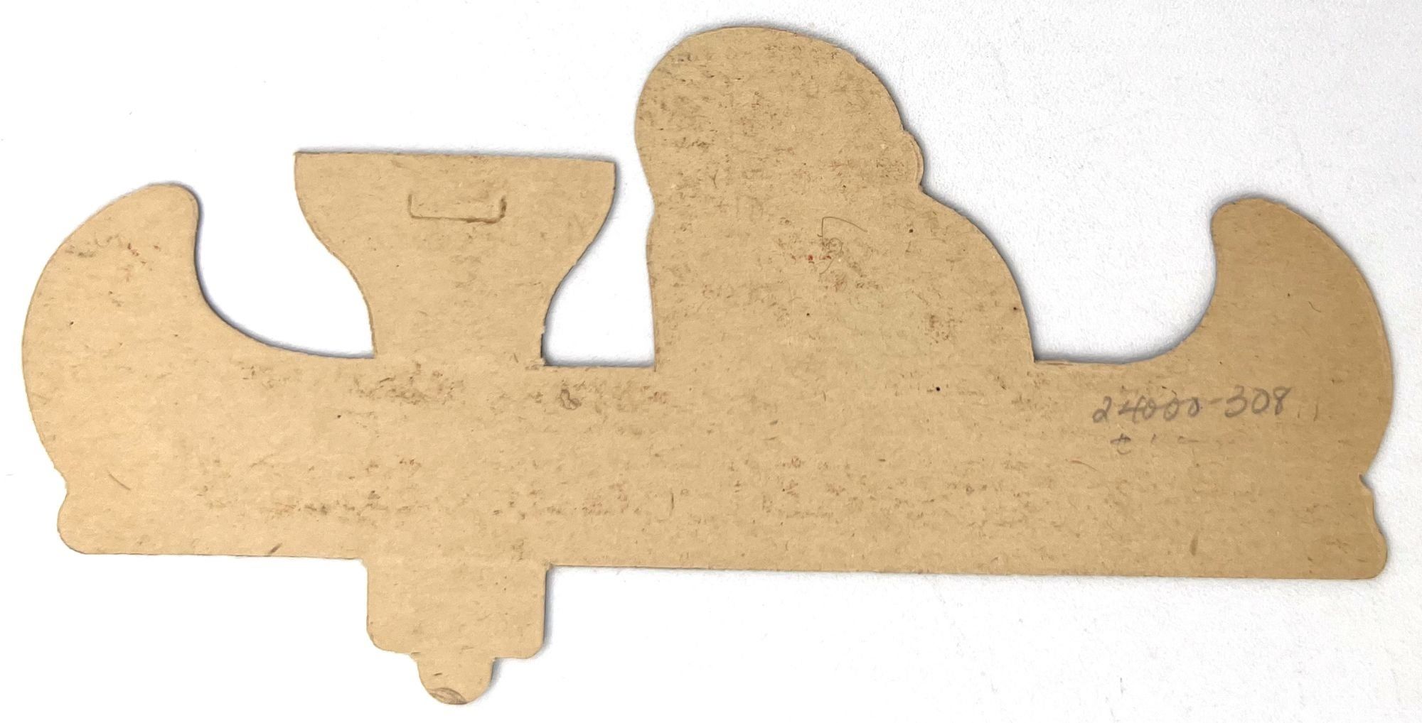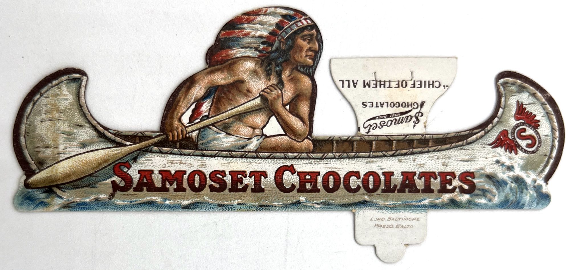 [Boston, Massachusetts]: [Samoset Chocolates Co.], 1900. Near-fine. Light toning to verso.. A self-standing advertising card promoting the Samoset Chocolates brand, using (exploiting?) a stereotypical image of a Native American man in feathered headdress rowing a canoe. Includes two tabs to help the canoe stand upright, with the slogan "Chief of them all" on the upper tab. The brand released at least one other variation of this card, depicting instead a female Native American in a canoe. The brand also produced sturdier plaster models of similar images for display on shop counters. Chromolithographed a pre-die cut, this example has not yet been used or folded. Measures approx. 2" by 5