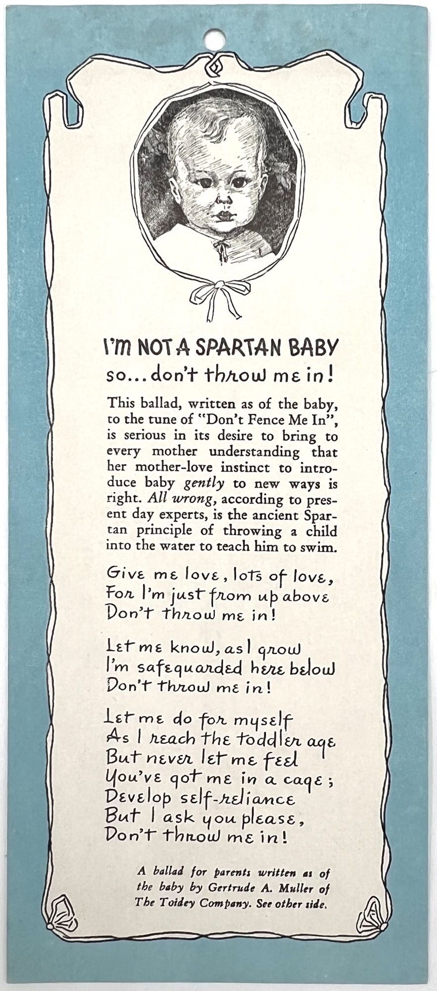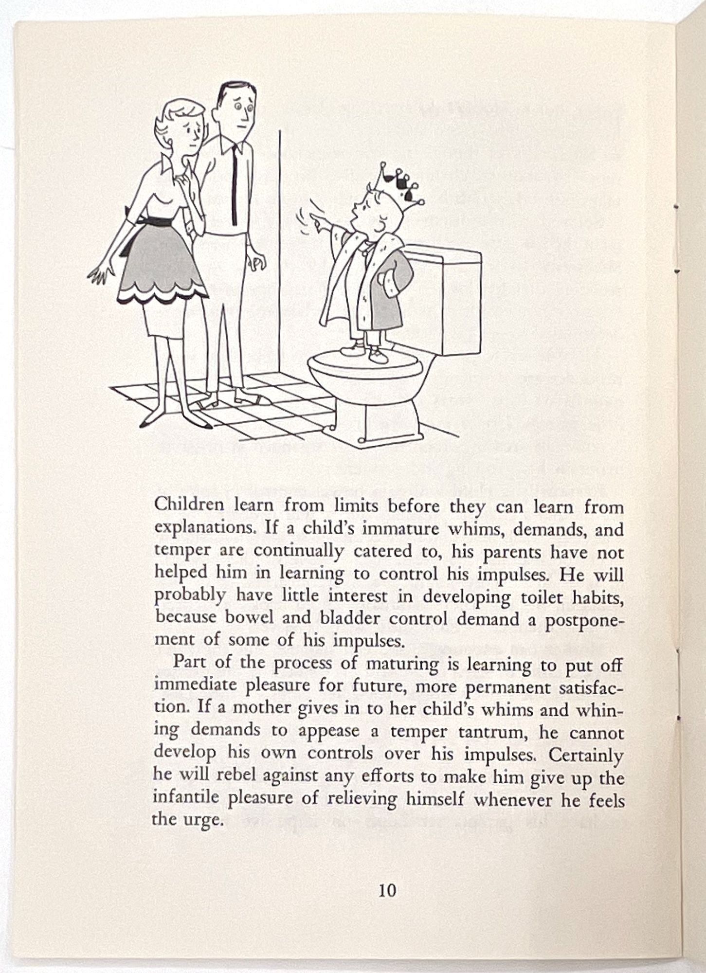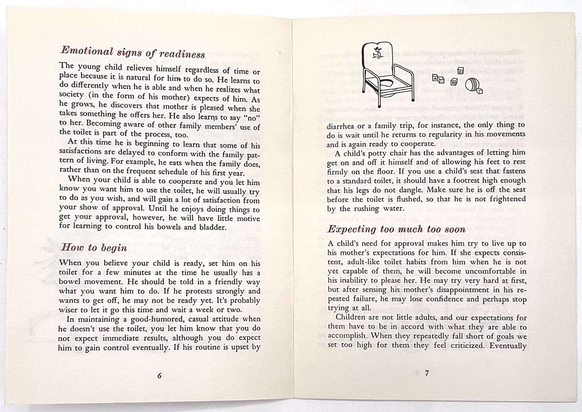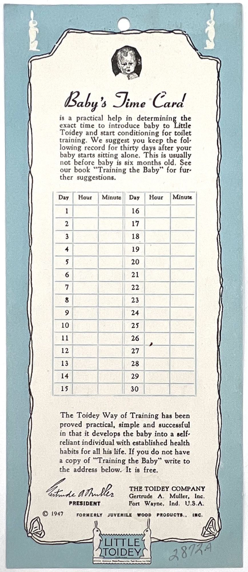 United States, 1962. Very good.. Two (2) pieces of ephemera offering parents advice for toilet training little ones, published in 1947 and 1962. Both promote companies. The first promotes "Toidey" brand training toilets; on the front is a "Time Card" which parents can use to start tracking baby's bowel movements, and on the back are whimsical song lyrics for the song "I'm Not a Spartan Baby so... don't throw me in!". The second item is a brief booklet on toilet training for parents, offering descriptive and practical advice. Published by Ross Laboratories, it was published to help market pharmaceuticals and family. care products produced by the companies. Provides interesting insight into parenting at the time, and how companies marketed products to families.