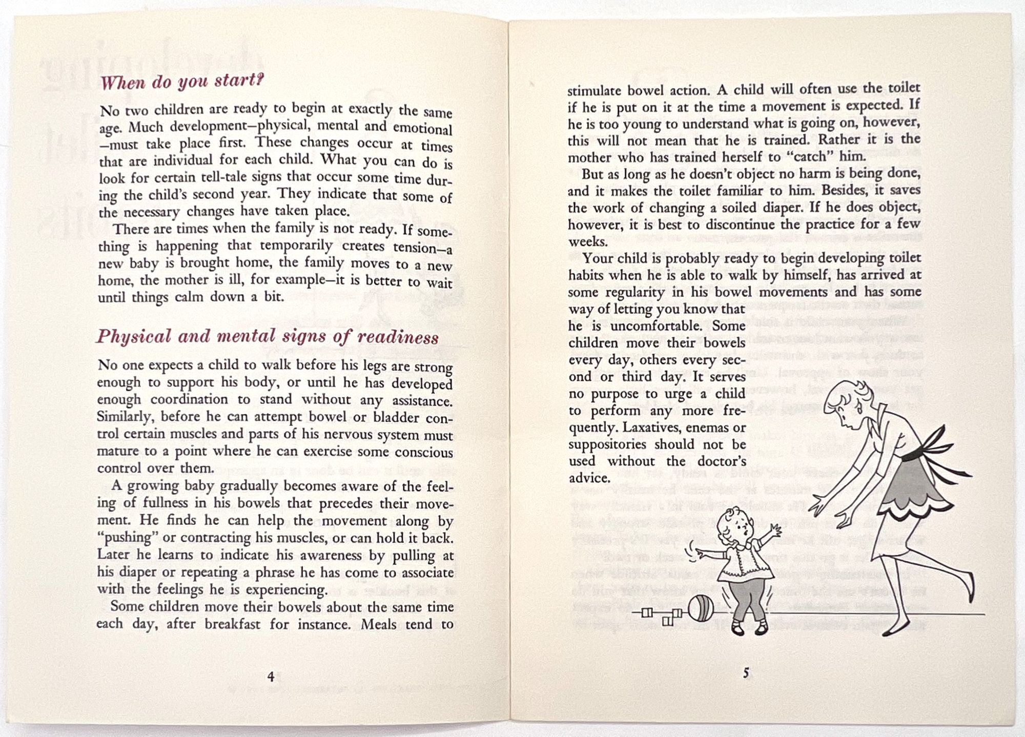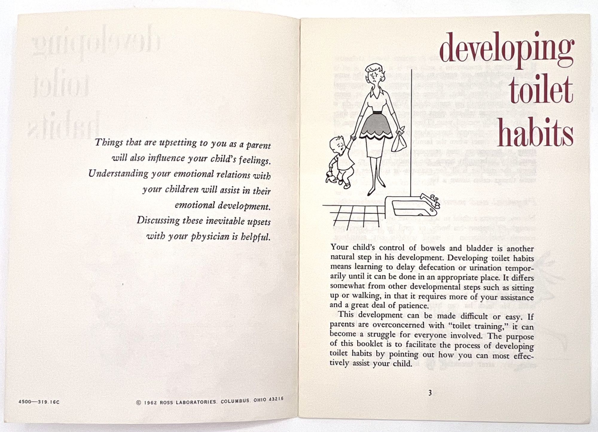 "Developing Toilet Habits". Columbus: Ross Laboratories, 1962. Single vol. (7" by 5"), pp. 16, illus., in original illus. pink wrps with image of baby in profile on front.