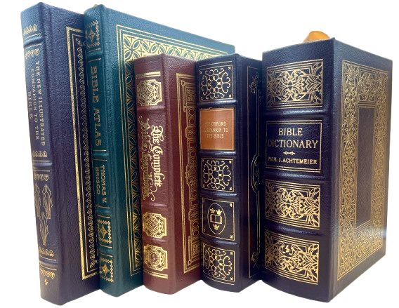 Norwalk, CT: Easton Press. Collector's Edition. Leather bound. Very Good. Bound in various hues of bonded leather. Each with elaborate gilt ornamentation and raised bands. Moire endsheets. All edges gilt. With gold hued satin ribbon pagemarkers - some with a bit of fraying at ends. Sporadic light rubbing to extremities, and scratching to gilt edges. A compiled set of leatherbound, Easton Press biblical companion books.