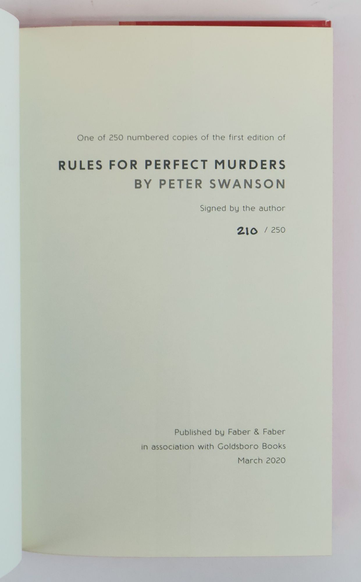 London, UK: Faber & Faber Ltd, 2020. First UK Edition, First Printing. Hardcover. Octavo, 270 pages. In Very Good condition with Near Fine condition dust jacket. Spine is red with white and black lettering. Dust jacket protected by mylar covering, price uncut: "£12.99" on front flap. Boards have mild shelving wear along spine tail. Text block edges dyed red. Signed flat by Peter Swanson on title page. Shelved in hallway. 1387990. Special Collections.