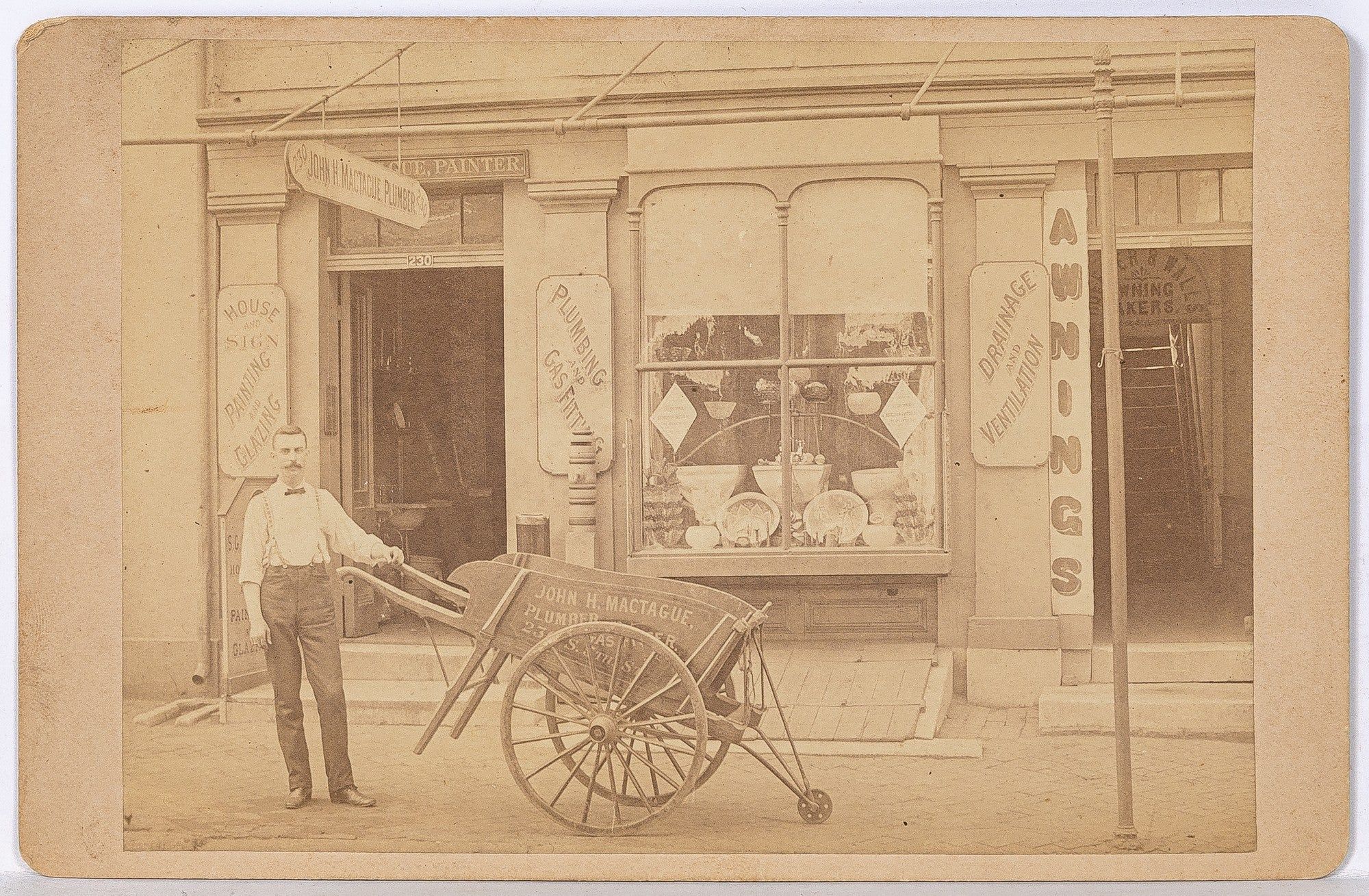 [Philadelphia], 1880. Unbound. Near Fine. Cabinet card. Photograph measuring 5½" x 4", mounted to a card measuring 6½" x 4¼". Card lightly toned and with a touch of soil, tiny ink stain on the verso, a couple of small bumps, near fine overall. The photo shows a Philadelphia man, presumedly John H. MacTague, out front of his business, posed with a wooden push cart, the side reading "John H. MacTague, Plumber, 230 S. 5th St." On the walls of the business behind him, signs for a variety of services can be seen, including plumbing and gas fitting, house and sign painting, drainage and ventilation. We came across evidence that suggests that MacTague was a drainage inspector for the city in the 1890's.
