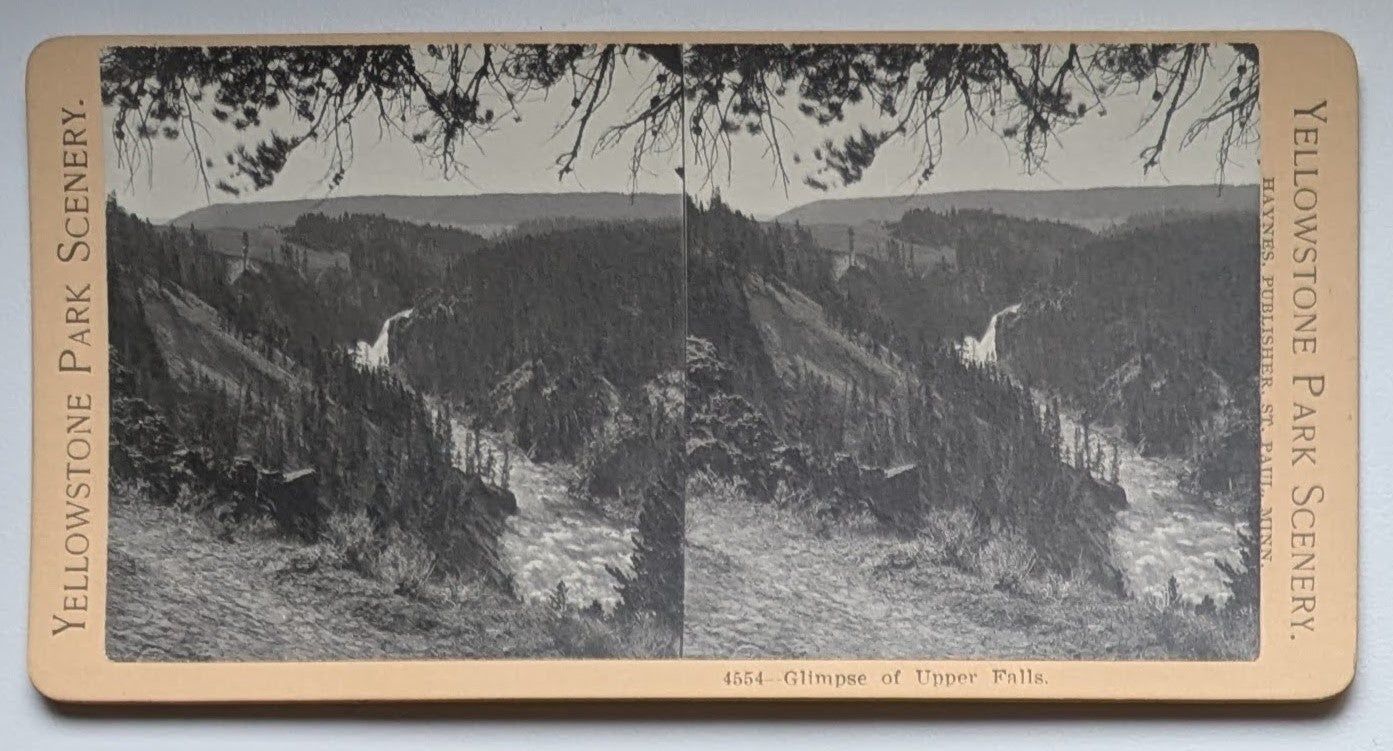 St. Paul, Minn: Haynes, Publisher, 1900. [4000 Series]. Photograph. Near Fine. Stereoview photograph on a tan Yellowstone Park Scenery mount [9 cm x 18 cm]. Title printed in black at bottom margin beneath right image. This view looks down upon the Yellowstone River from a slope above, showing the Upper Falls framed centrally from a long distance.