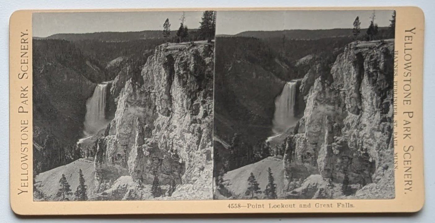 St. Paul, Minn: Haynes, Publisher, 1900. [4000 Series]. Photograph. Near Fine. Stereoview photograph on a tan Yellowstone Park Scenery mount [9 cm x 18 cm]. Title printed in black at bottom margin beneath right image. A nicely composed view looking directly toward the Great Falls from a middle distance, showing various levels of the canyon both below and above.