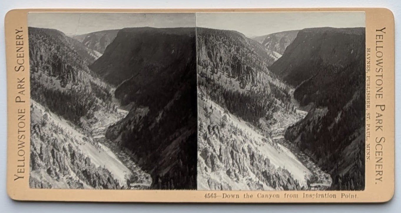 St. Paul, Minn: Haynes, Publisher, 1900. [4000 Series]. Photograph. Near Fine. Stereoview photograph on a tan Yellowstone Park Scenery mount [9 cm x 18 cm]. Title printed in black at bottom margin beneath right image. This stereoview exhibits excellent composition and contrast showing the ebb and flow of the Yellowstone River and its canyon slopes, as seen from Inspiration Point.