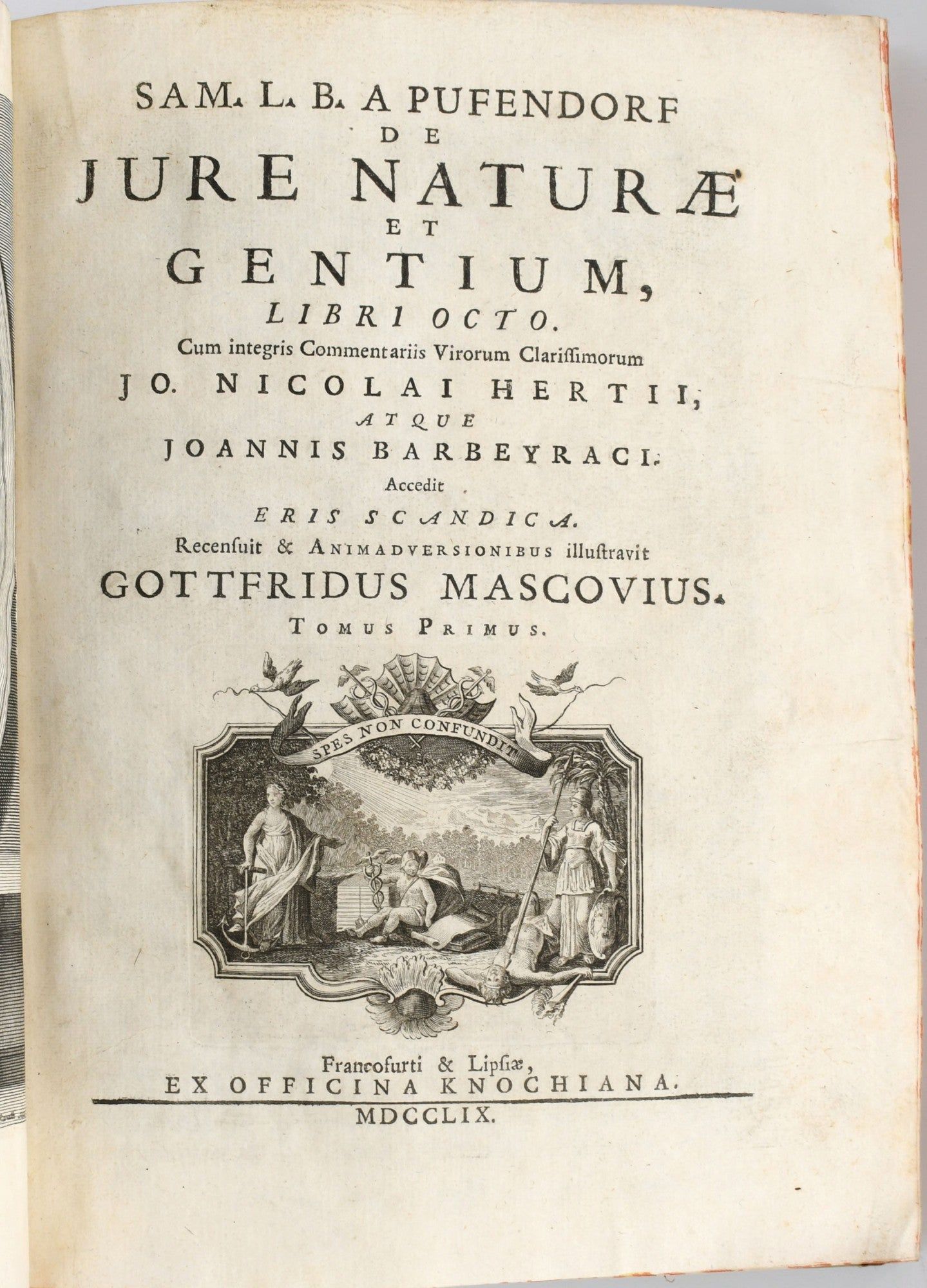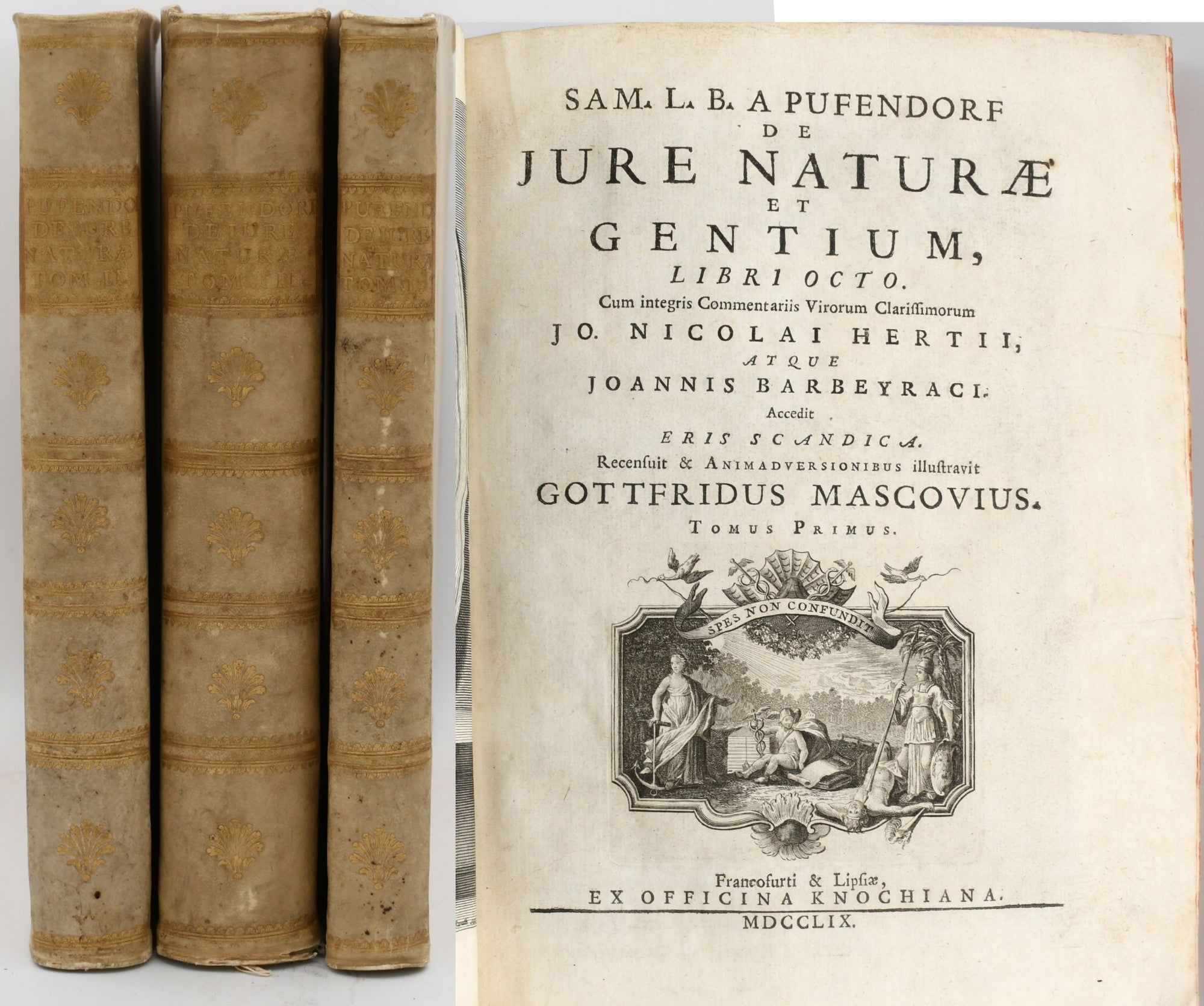 [PHILOSOPHY] DE JURE NATURAE ET GENTIUM, LIBRI OCTO. CUM INTEGRIS COMMENTARIIS VIRORUM CLARISSIMORUM JO. NICOLAI HERTII, ATQUE JOANNIS BERBEYRACI, ACCEDIT ERIS SCANDICA. [3 VOLUMES]