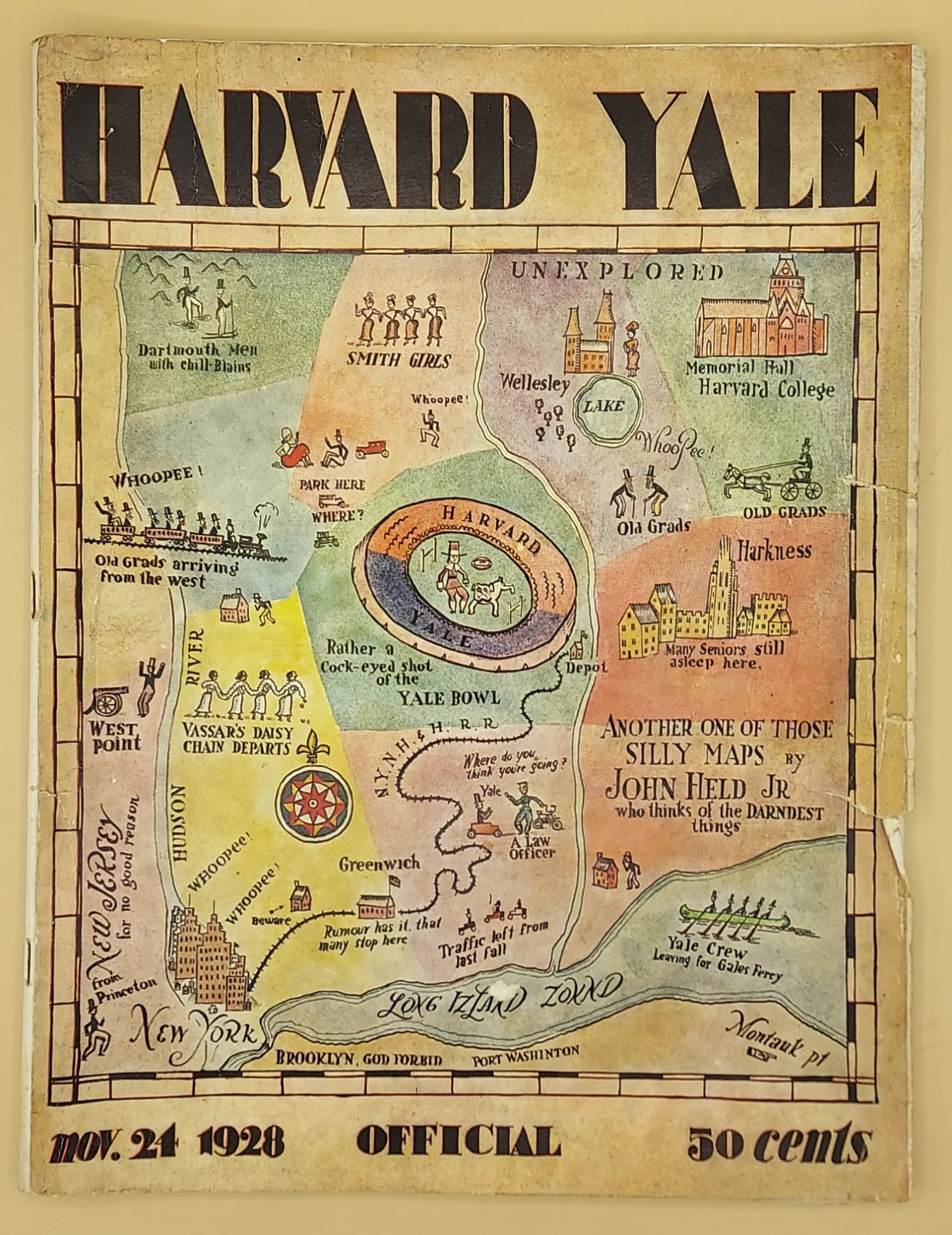 The cover of this publication features one of Held's maps. Held's maps illustrate the diversity of his art, while at the same time serving to demonstrate Held's interpretation of various notable places and things. Kori Alexander writes in his article entitled Relevant Magic in the Art of John Held Jr., "While it was Held's caricatures of the young college chaps and flapper girls that earned him public notoriety, it was his linoleum cuts and pen and ink maps that fortified his legitimacy as a social commentator." (Virginia Commonwealth University website).