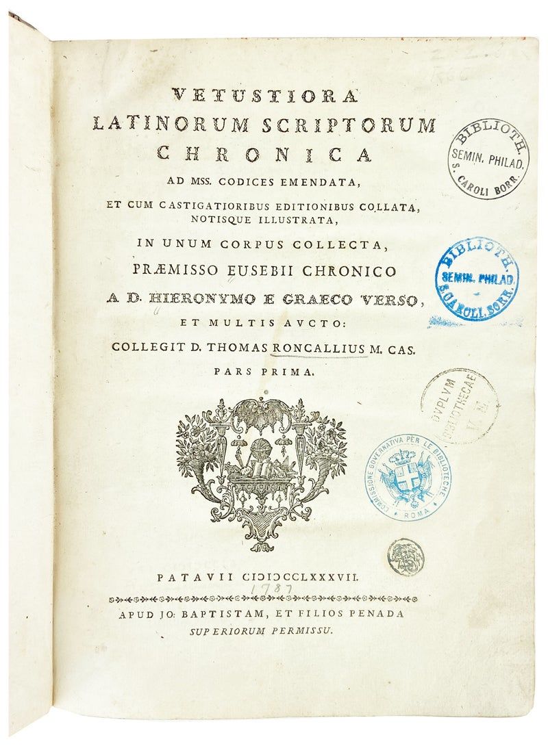 Patavii [Padua]: Apud Jo. Baptistam, et Filios Penada, 1787. Very Good. Patavii [Padua]: Apud Jo. Baptistam, et Filios Penada, 1787. First Edition. Two volumes; large quartos (29cm.); contemporary parchment over block-printed paper-covered boards, tan gilt-lettered spine labels, all edges speckled red; collated complete; text printed in double columns. Ex-St. Charles Seminary Library with spine shelf labels and rather extensive rubber-stamping throughout text blocks, parchment quite dust-soiled, boards a bit scuffed at margins, else a Very Good, internally fresh and sound set.