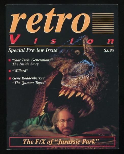 Massapequa Park NY: RetroVision. Near Fine. 1997. Special Preview Issue. Magazine. [very slight edgewear to covers, small note "dup" written inside the letter "O" in the title]. (B&W photographs, graphics) An un-numbered "preview edition" of this short-lived magazine whose stated approach was to "look into Hollywood's recent past on both the big screen and the small; a recent past that has proven mroe influential in which we see today than productions from forty or fifty years ago." About one-third of the issue is devoted to various aspects of JURASSIC PARK (especially its special effects, and including an interview with Michael Crichton, author of the book on which the film was based). Also: "Gene Roddenberry's The Questor Tapes: The Unfulfilled Promise"; "'1941 Will Go On Forever': Steven Spielberg and The Aesthetics of Disaster"; "Star Trek: Generations: Launching the Next Generation on Film" (described in the editorial as "undoubtedly the most indepth production piece ever presented on the making of that film"; at 19 pages, it's the longest piece in this 64-page publication); an article about the production of the rat horror movie WILLARD; a review of STAR TREK: FIRST CONTACT; an article on the making of STAR TREK II: THE WRATH OF KHAN, plus an interview with Khan him (Ricardo Montalban). The magazine seems to have ceased publication after only a year or so. .