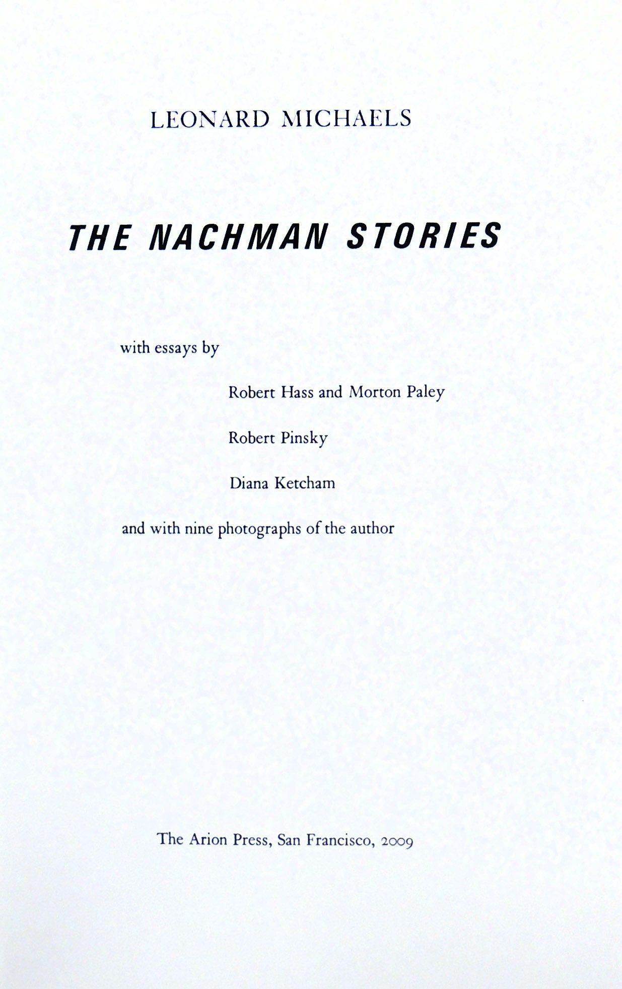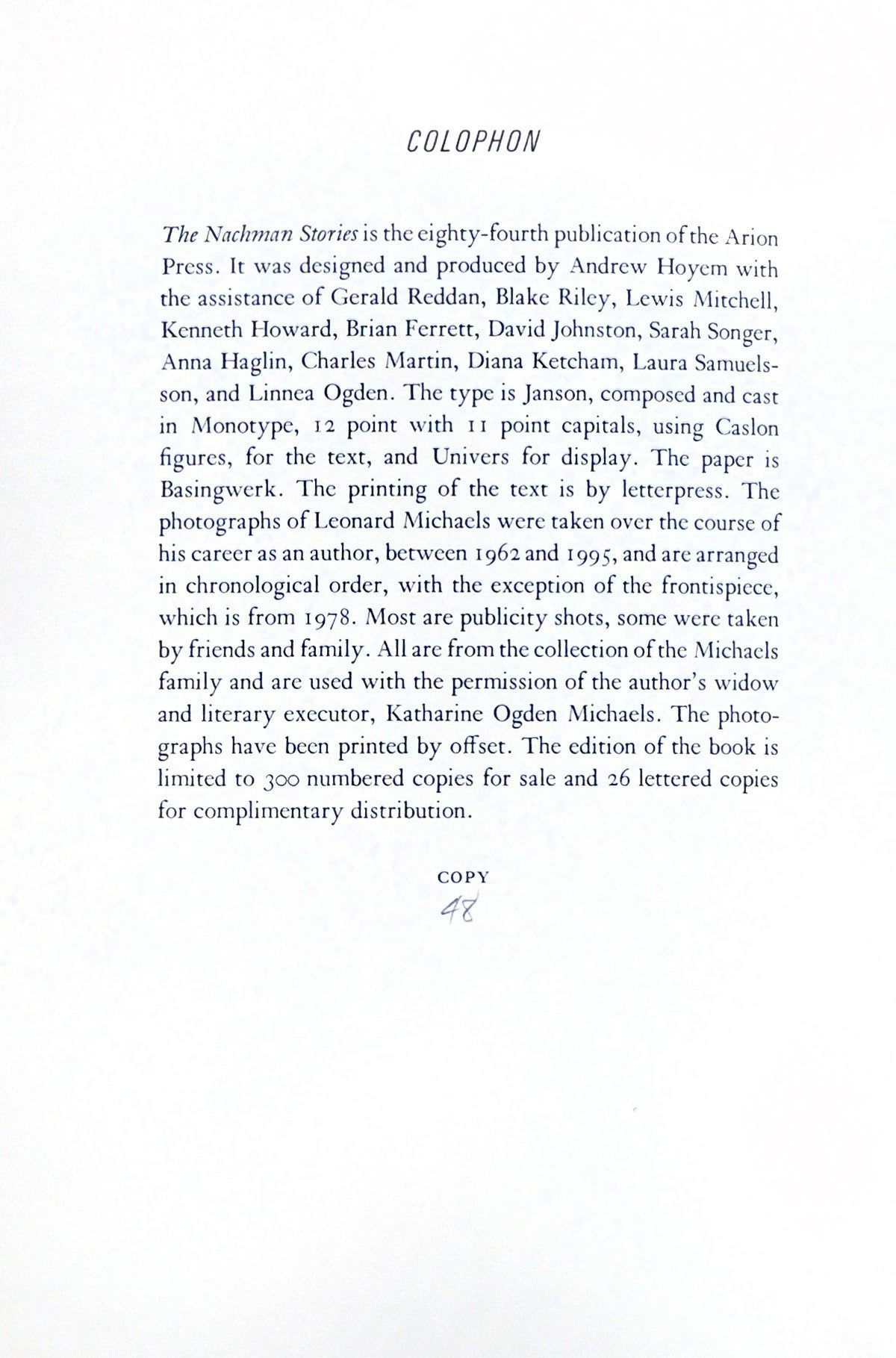 San Francisco: Arion Press, 2009. Hardcover. Fine. Hardcover. Number 48 of 300 numbered copies for sale and 26 lettered copies for complimentary distribution. This was the first collected edition of The Nachman Stories, the author's stories with Los Angeles mathematician Raphael Nachman as their hero. Written at the end of the author's life between 1997 and 2003. Leonard Michaels (1933-2003) was a prolific writer who received a Ph.D in English in 1967 and in 1969 became a professor at the University of California, Berkeley, from which he retired in 1994. This book contains nine photographic portraits of Michaels, They were taken over the course of his career as a writer between 1962 and 1995 and are arranged in chronological order with the exception of the frontispiece. This is a large octavo bound in full blue cloth, Iris Wisteria, with a titling band of Japanese Yatsuo handmade mustard colored paper running diagonally across the cover. The endpapers are gray mouldmade Italian Tiziano. Printed in Janson type with Caslon figures for the text and Univers for display, on gray Basingwerk paper. Accompanied by the prospectus. In fine condition. Measures 6.5 x 9 7/8 inches. 164 pages.