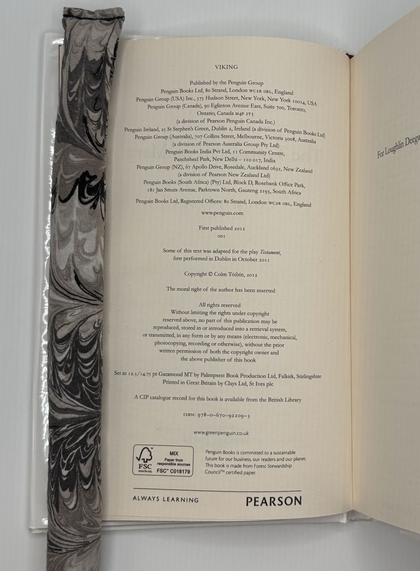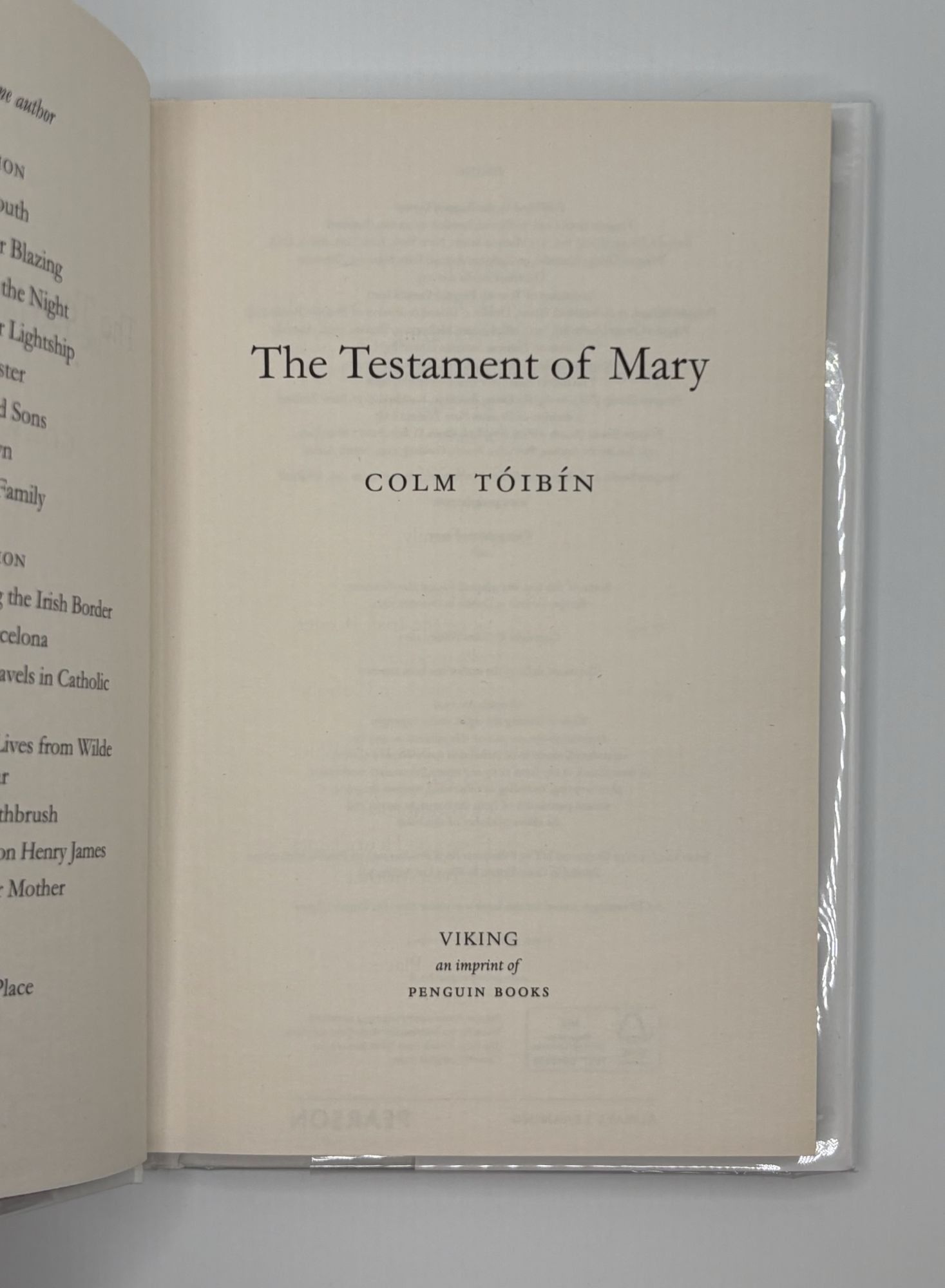 London, UK: Viking, 2012. First UK Edition, First Printing. Hardcover. Small Octavo, 104 pages. In Very Good condition with Very Good condition dust jacket. Spine is white with bronze metallic and gray lettering. Dust jacket protected by mylar covering, price uncut: "£12.99" on front flap, and has mild general soiling and shelving wear along spine tail. Boards have mild shelving wear along spine head and tail. Signed by Colm Tóibín on publisher's tipped-in limitation page. Shelved in hallway. 1388329. Special Collections.