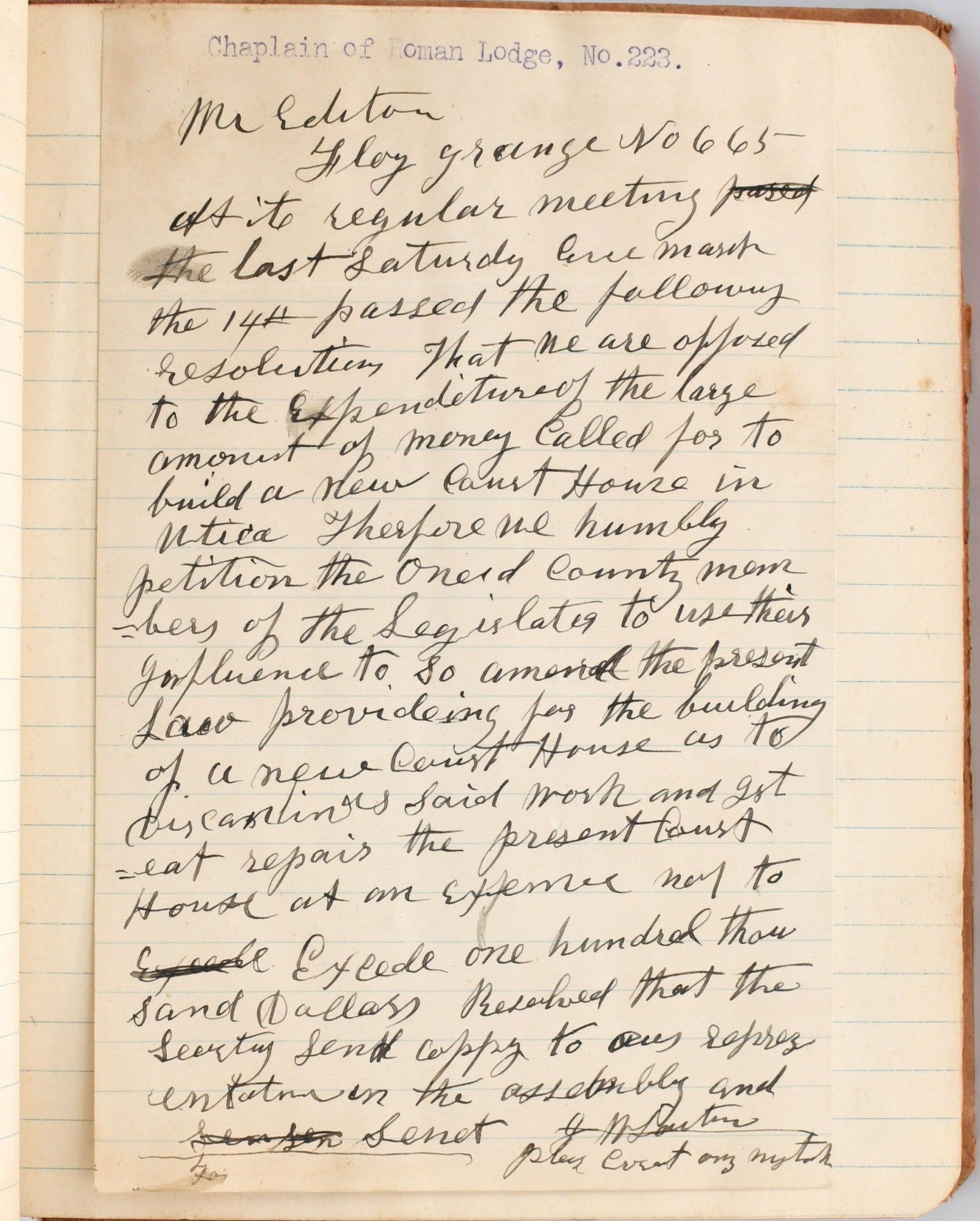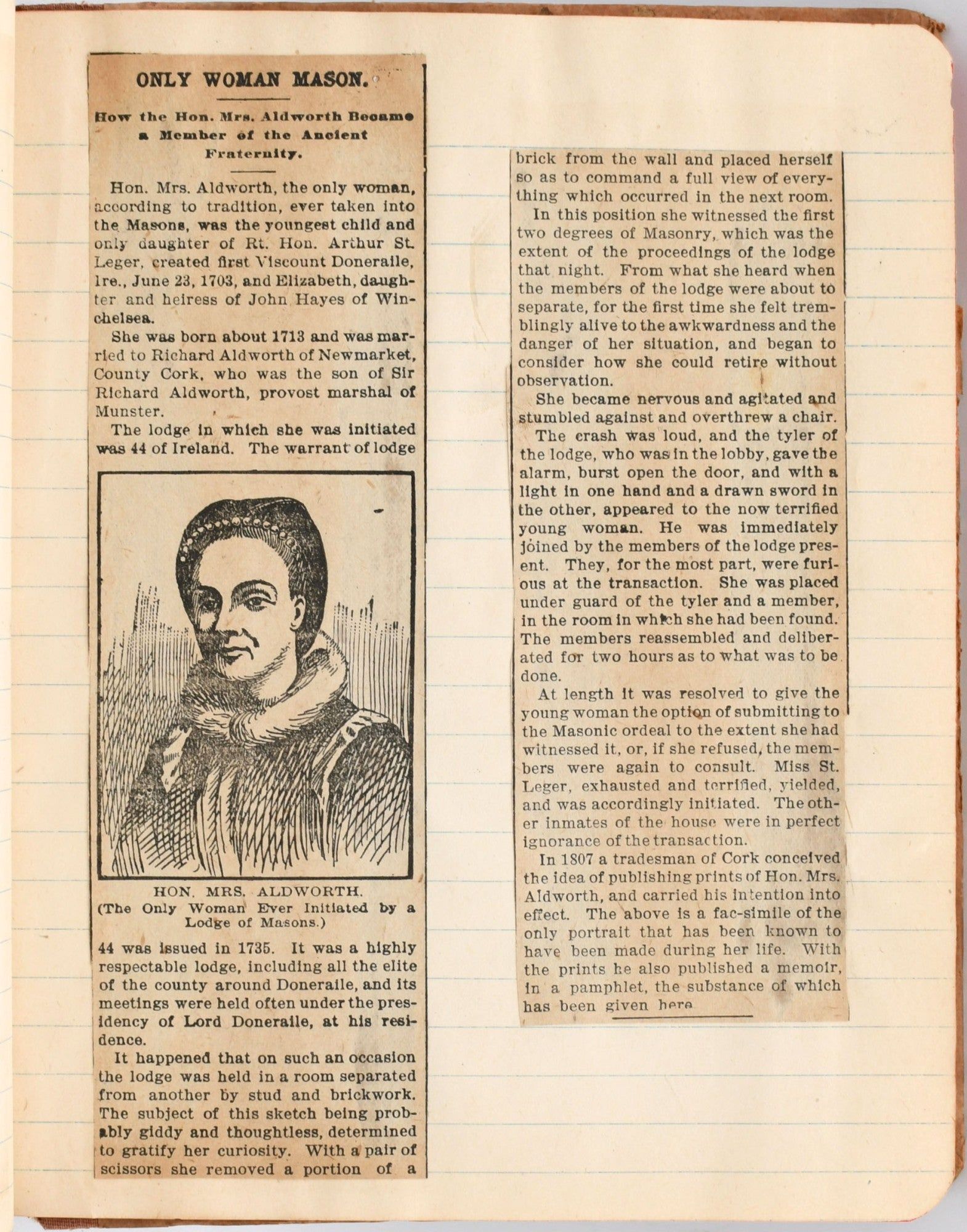 New York, 1903. 8 ¼” x 6 ¾” x ½” orange hardcover composition book with cloth binding and black stamped title on front cover. Bookplate states “Masonic” with associated imagery. Lined paper in good condition. Binding worn, top half of back cover was water damaged. Good.~~The author of this volume appears to have been a dedicated junior member of the Freemasons. He filled the pages with pasted articles from mostly unknown publications regarding freemasonry. They describe its practice, benefits, popularity, and the plans of different lodges. Of interest is the description of the Honorable Elizabeth Aldritch (~1693 - ~1773), the first woman freemason, who supposedly was caught snooping and offered initiation or death. One article is titled, “Freemasonry Has Illumined the Darkness of Benighted Ages”; another claims that Aztec caves were devoted to Freemasonry. ~~The second-to-last page has a pasted handwritten letter on letterhead stating, “Chaplain of Roman Lodge, No. 223” and written to “Mr. Editor”. The letter-writer discusses the expenditure of a large amount of money to built a new courthouse in Utica, NY. and asking local lawmakers to amend the law to allow the building of a new courthouse or else repair the current courthouse for not more than $100,000. The last page shows a clipping of Christopher G. Fox, a Buffalo man re-elected Grand Secretary Royal Arch Mason of US, and dated 1903. ~.