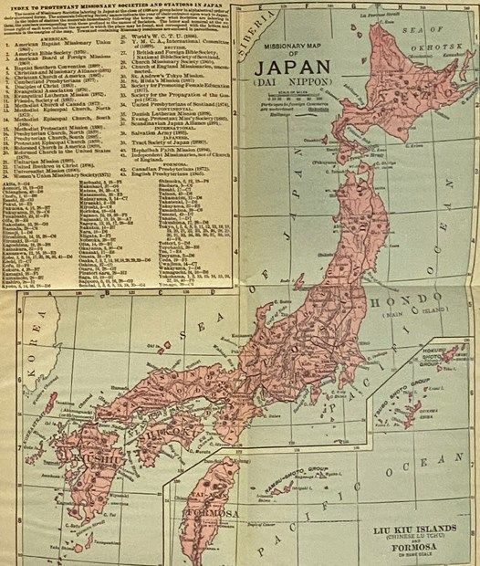 New York: Student Volunteer Movement for Foreign Missions, 1904. Revised Edition. Trade Paperback. Good. John Foster Dulles's copy, with his name and Princeton address on front flyleaf. Spine faded and creased with some loss from head and foot, edges of rear wrapper faded, edges lightly foxed. 1904 Trade Paperback. iv, 151 pp. Color fold-out map follows text. A brief history of Japan and an account of Christian missionary work in the country, with appendices on Formosa, bibliographical references, statistics of Christian missions, analytical index, pronunciations of Japanese words, and map showing locations of Protestant missionary societies and stations.