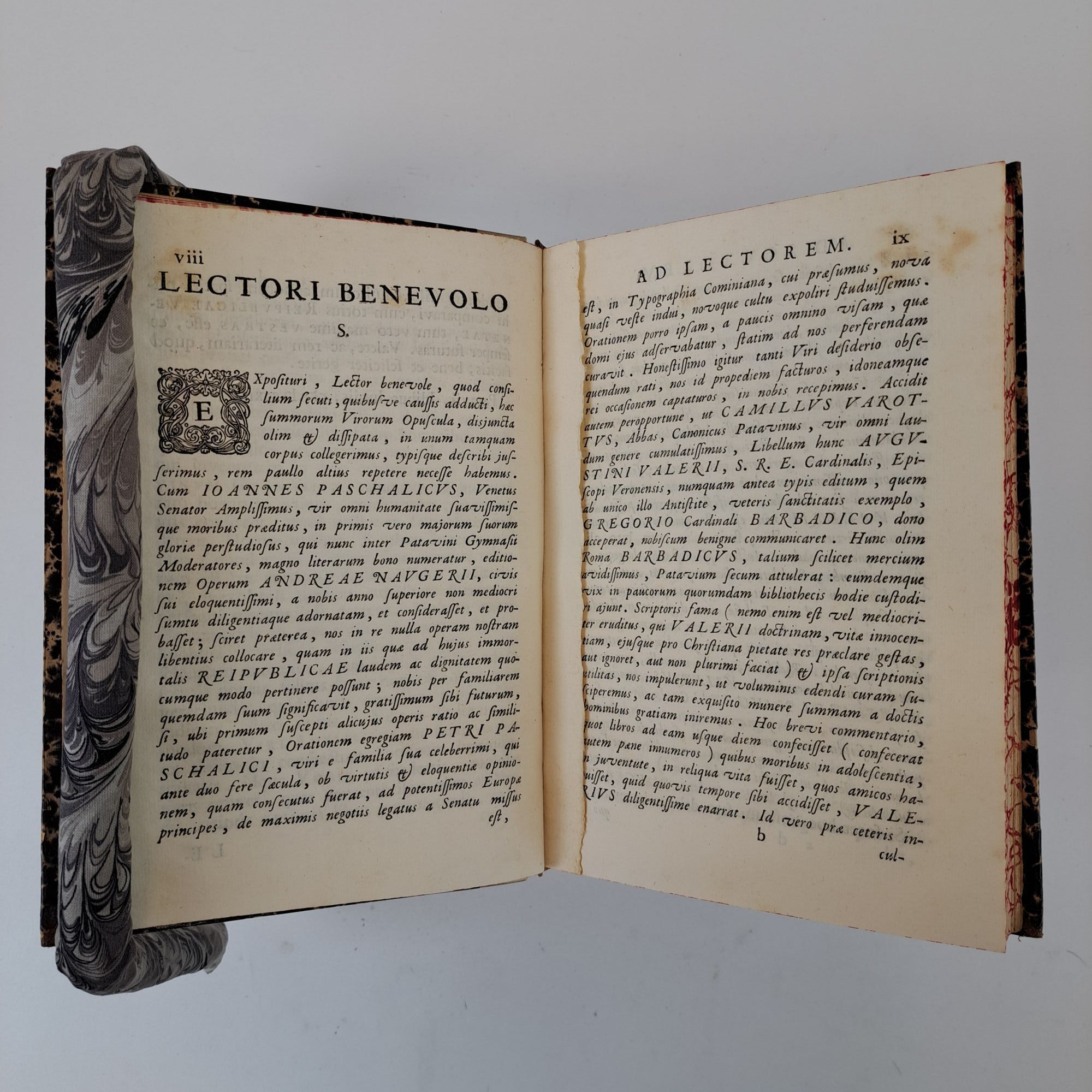 Patavii [Padua]: Iosephus Cominus [Giuseppe Comino], 1719. Hardcover. Small quarto, xxviii, 317, [3] pages. In Very Good condition. Rebound in 19th century quarter vellum with boards of marbled paper over cloth and black titling to spine. Late 19th or early 20th-century paper library label to spine. Light rubbing and chipping to edges and corners of boards; light bumping to tail of spine. Front hinge starting. Text block lightly age toned with very light scattered foxing. Text block edges marbled red. Shelved in Room G. 1388535. Special Collections.