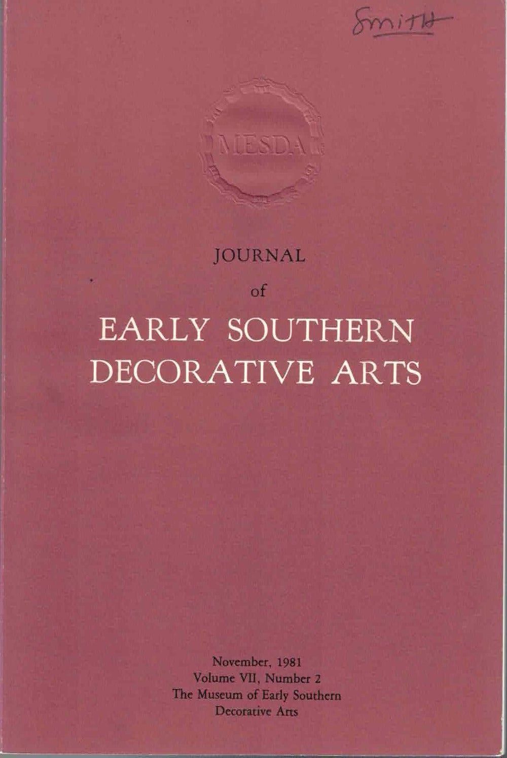 Journal of Early Southern Decorative Arts, November 1981, Volume VII, Number 2
