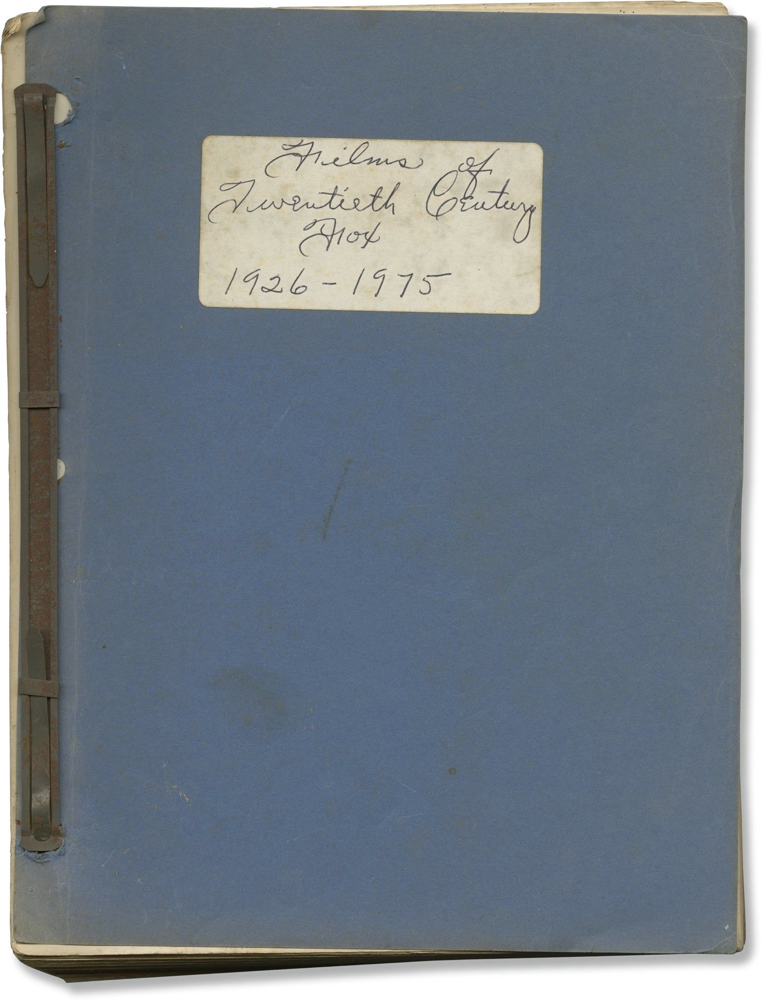 Blue untitled wrappers, with "Films of Twentieth Century Fox / 1926-1975" written on a label in black ink. 261 pages, with the last page of text numbered 259. Xerographic duplication, rectos only. Pages Near Fine, wrapper Very Good plus, with front wrapper detached, bound with a prong binding.