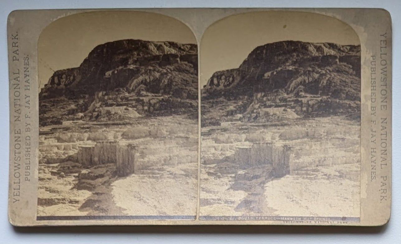 Fargo, D.T. [Dakota Territory]: F. Jay Haynes, 1884. [1000 Series]. Photograph. Very Good. Stereoview photograph on a tan Yellowstone National Park mount [10 cm x 18 cm]. Yellowstone National Park backstamp. Title is shown in a black title strip along the bottom edge of the right image. Lightly soiled and smudged along edges of the mount. A nice view of the successively ascending south terraces at Mammoth Hot Springs.