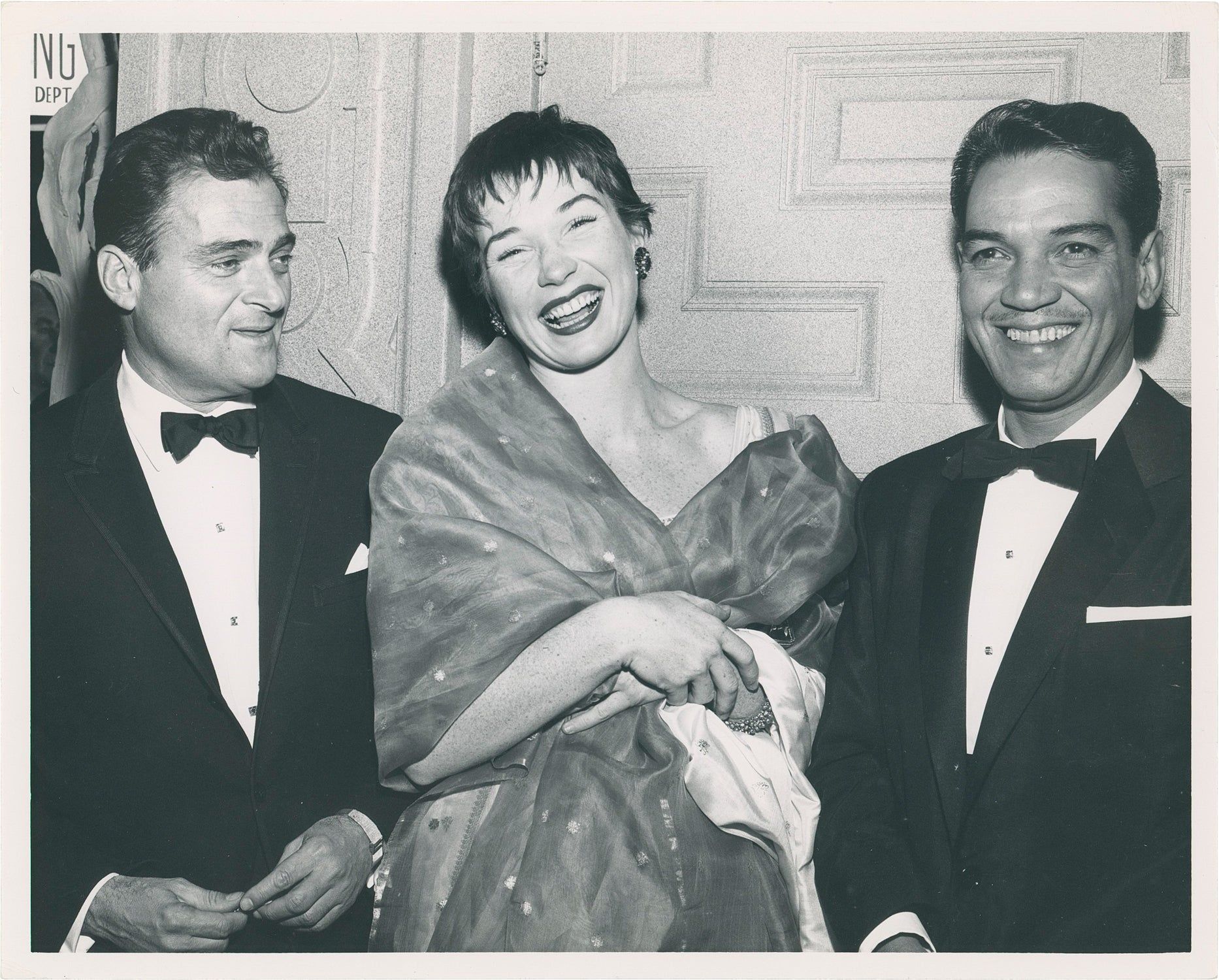 N.p.: N.p., 1956. Vintage photograph of actors Shirley MacLaine and Cantinflas with producer Mike Todd at the premiere of the 1956 film, held on October 17, 1956, at the Rivoli Theatre in New York. Mimeo snipe on the verso.