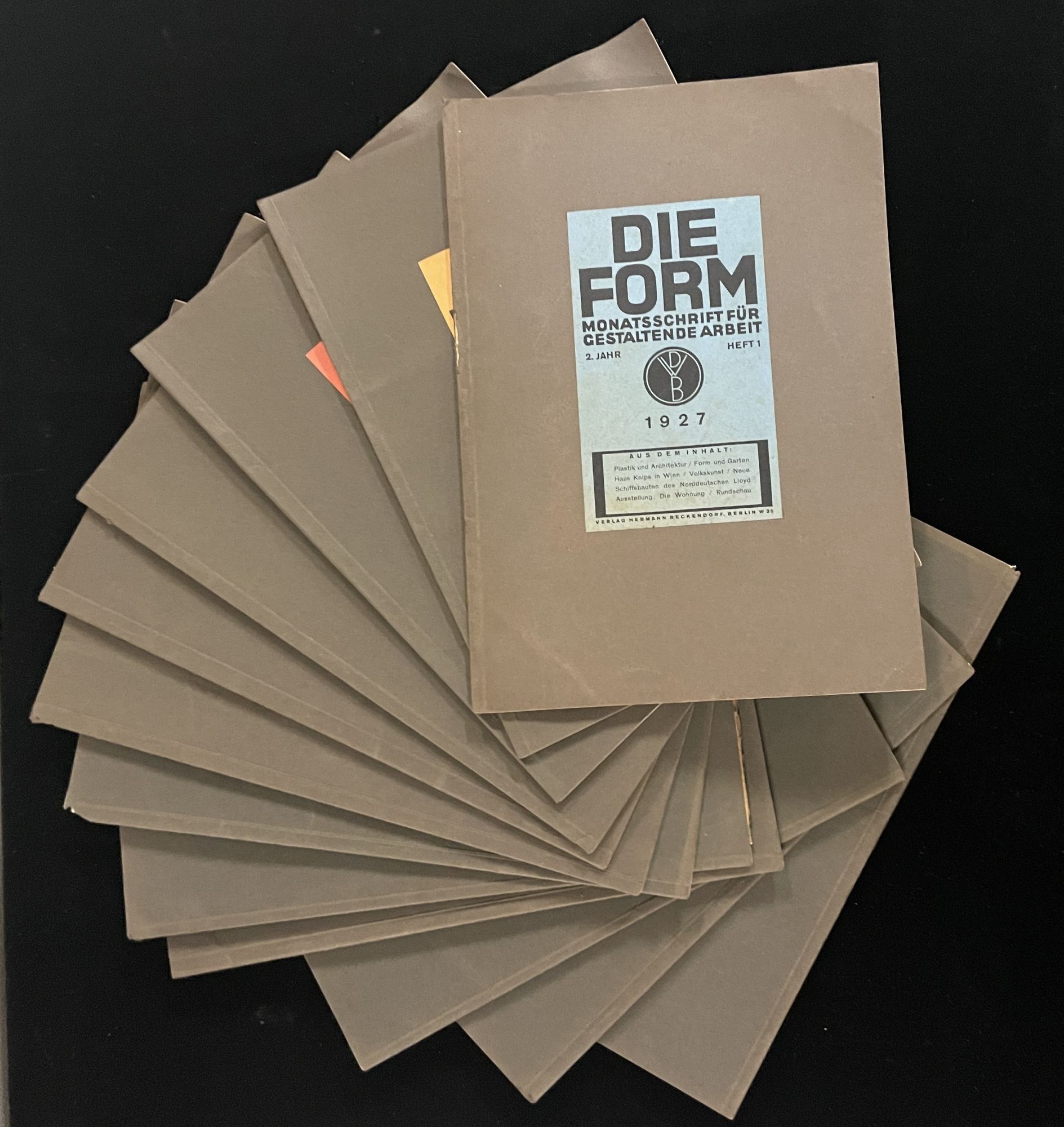 Berlin: Verlag Hermann Reckendorf, 1927. Soft cover. Near Fine. Complete run - 12 issues - of Volume 2 of DIE FORM, a German monthly journal for design, architecture and decorative arts, for the year1927. Some incidental wear at a corner of several of the issues, else remarkably well-preserved.